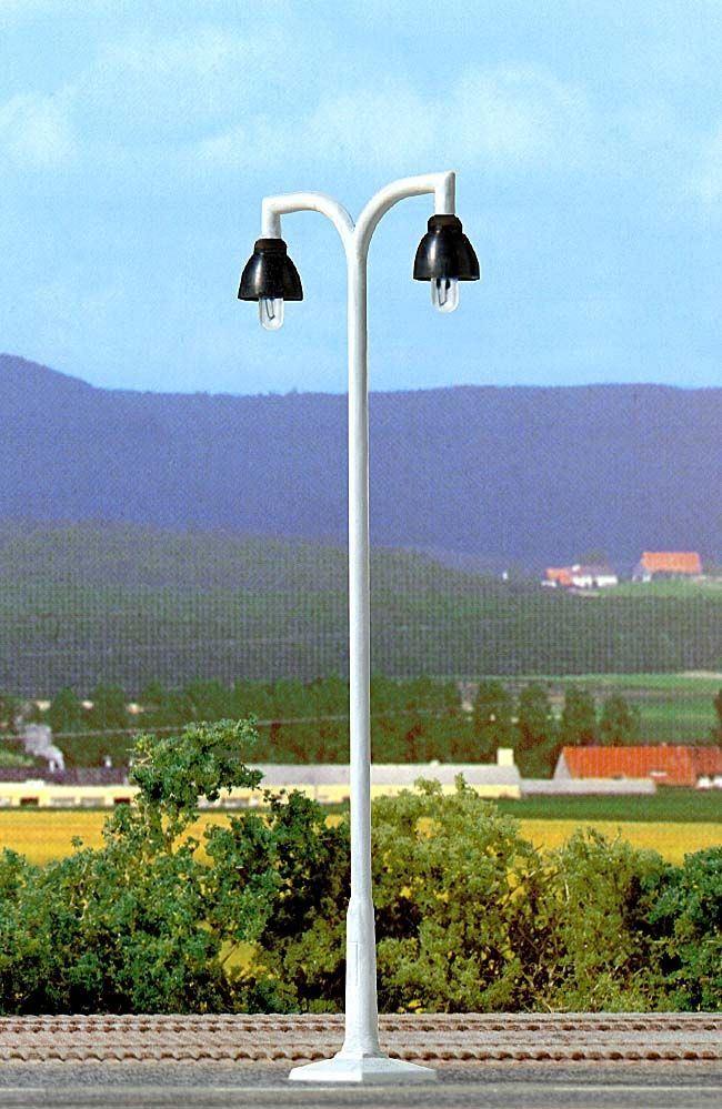 Typische Industrieleuchte, wie sie seit den siebziger Jahren in der DDR eingesetzt wurde und in den neuen Bundesländern heute noch weit verbreitet ist. Die Bauform eignet sich hervorragend zur Kombination mit LPG-Gebäuden, ist aber auch für sonstige Industrie-Szenen geeignet. Am oberen Ende des Gittermastes befinden sich filigrane Isolatoren. <br><br>Realistische Nachbildung des hellen Lichtes, das im Original durch Quecksilberdampflampen erzeugt wurde, durch weiße Neon-LEDs. Der Gittermast kann mit weiteren Leuchtkörpern aus dem Set H0 4152 bestückt werden. Höhe: 105 mm.