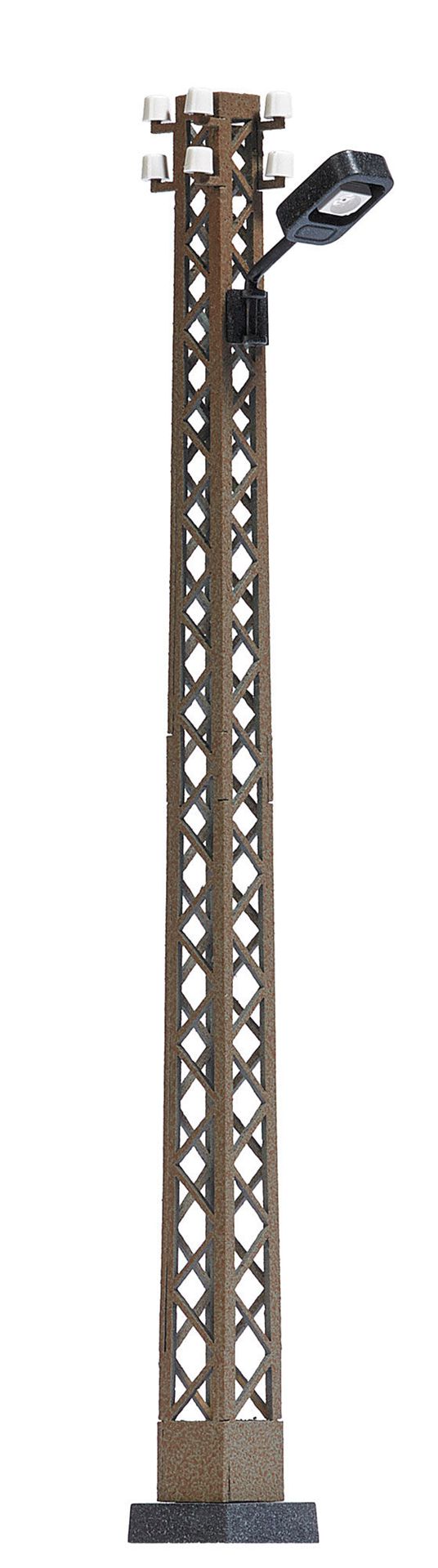 Typische Industrieleuchte, wie sie seit den siebziger Jahren in der DDR eingesetzt wurde und in den neuen Bundesländern heute noch weit verbreitet ist. Die Bauform eignet sich hervorragend zur Kombination mit LPG-Gebäuden, ist aber auch für sonstige Industrie-Szenen geeignet. Am oberen Ende des Gittermastes befinden sich filigrane Isolatoren. <br><br>Realistische Nachbildung des gelb/orangenen Lichtes, das im Original durch Natriumdampflampen erzeugt wurde, durch gelb/orangene LEDs. Der Gittermast kann mit weiteren Leuchtkörpern aus dem Set H0 4132 bestückt werden. Höhe: 105 mm.
