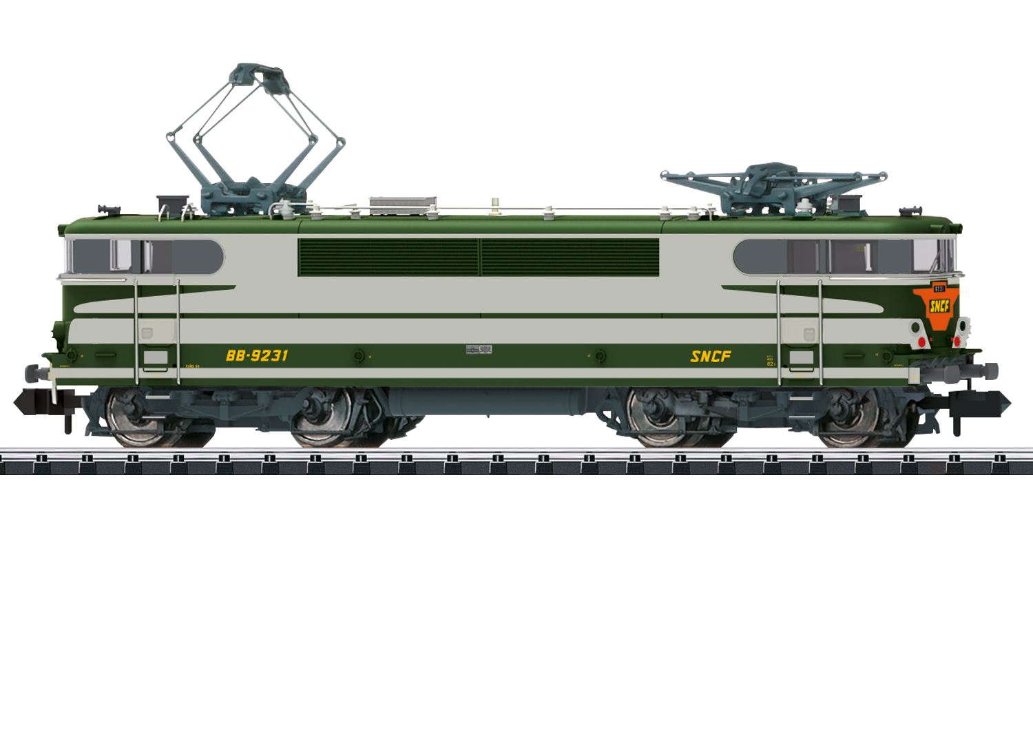 Vorbild: Schnellzugelektrolokomotive BB 9231 in der besonderen Farbgebung Arzens der Französischen Staatseisenbahnen (SNCF). Betriebszustand um 1985. Baujahr ab 1957.<br>Modell: Formvariante. Eingebauter Digital-Decoder und Geräuschgenerator zum Betrieb mit mfx und DCC. Motor mit Schwungmasse, 4 Achsen angetrieben, Haftreifen. Stirnbeleuchtung und Schlusslichter mit der Fahrtrichtung wechselnd, mit warmweißen Leuchtdioden, Führerstandsbeleuchtung, digital schaltbar. Kinematik für Kurzkupplung. Angesetzte Griffstangen. Fahrtrichtungsabhängig wechselndes Spitzensignal analog in Betrieb.Länge über Puffer 101 mm.