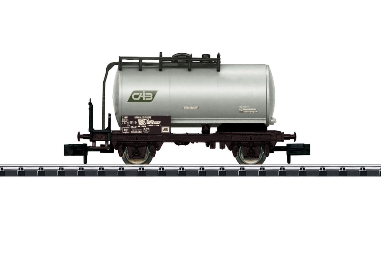 Vorbild: 2-achsiger Kesselwagen CAIB, eingestellt bei der Belgischen Staatsbahn (SNCB/NMBS).<br>Modell: Angesetzte Bühne, Laufsteg und Aufstiegsleiter. Detailliertes Fahrgestell mit durchbrochenem Rahmen. Vereinfachte Ausführung. Länge über Puffer 55 mm.