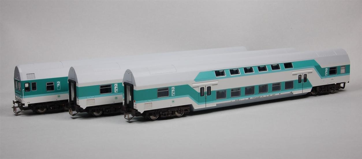 Doppelstockwagen-Set N 1:160 Doppelstocksteuerwagen Dbmq und 2 Doppelstockwagen DBmu, mint-grün, DR, Epoche V, unterschiedliche Wagennummern Steuerwagen mit fahrtrichtungsabhängiger Beleuchtung ...