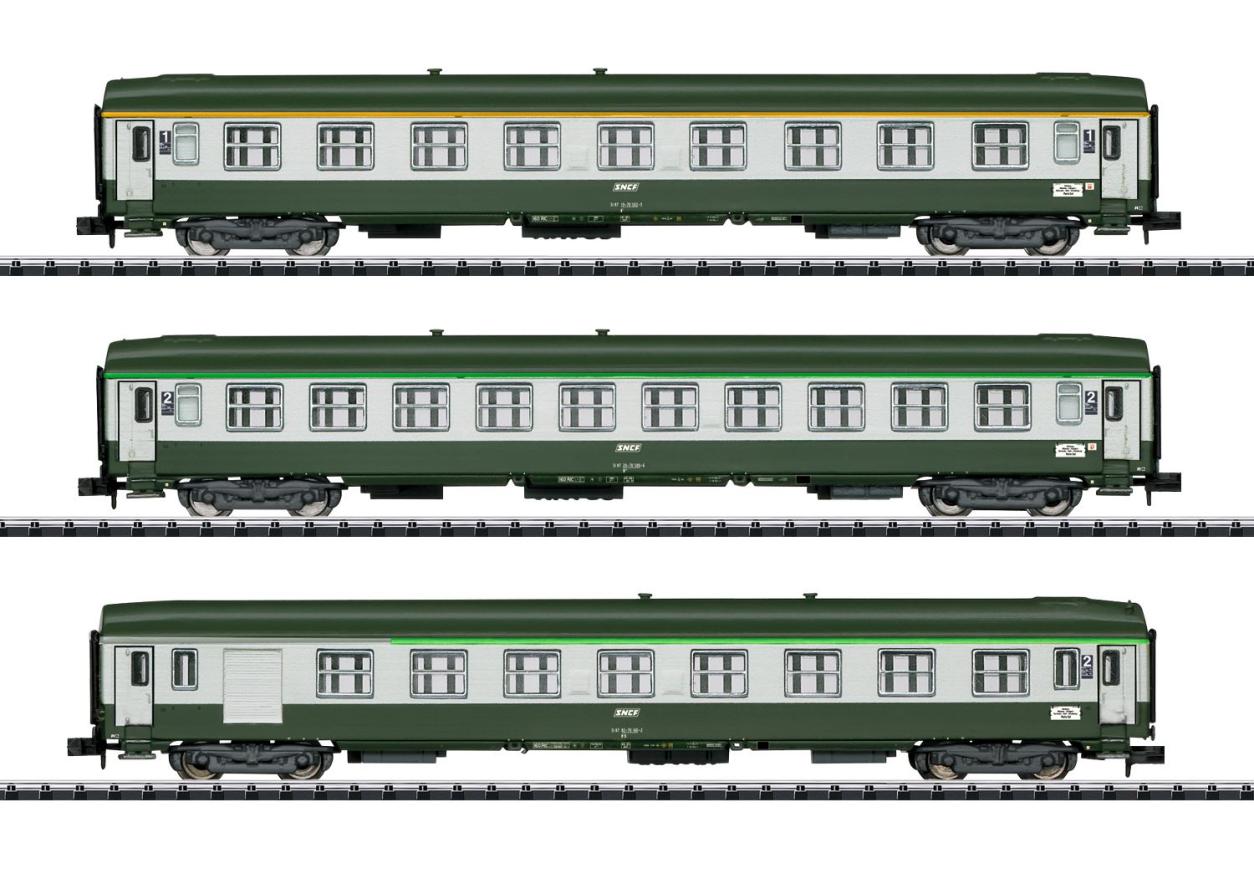 Vorbild: 1 Schnellzugwagen 1. Klasse (A9), 1 Schnellzugwagen 2. Klasse (B10) und 1 Schnellzugwagen mit Gepäckabteil (B7D) der Französischen Staatseisenbahn (Société nationale des chemins de fer français / SNCF).