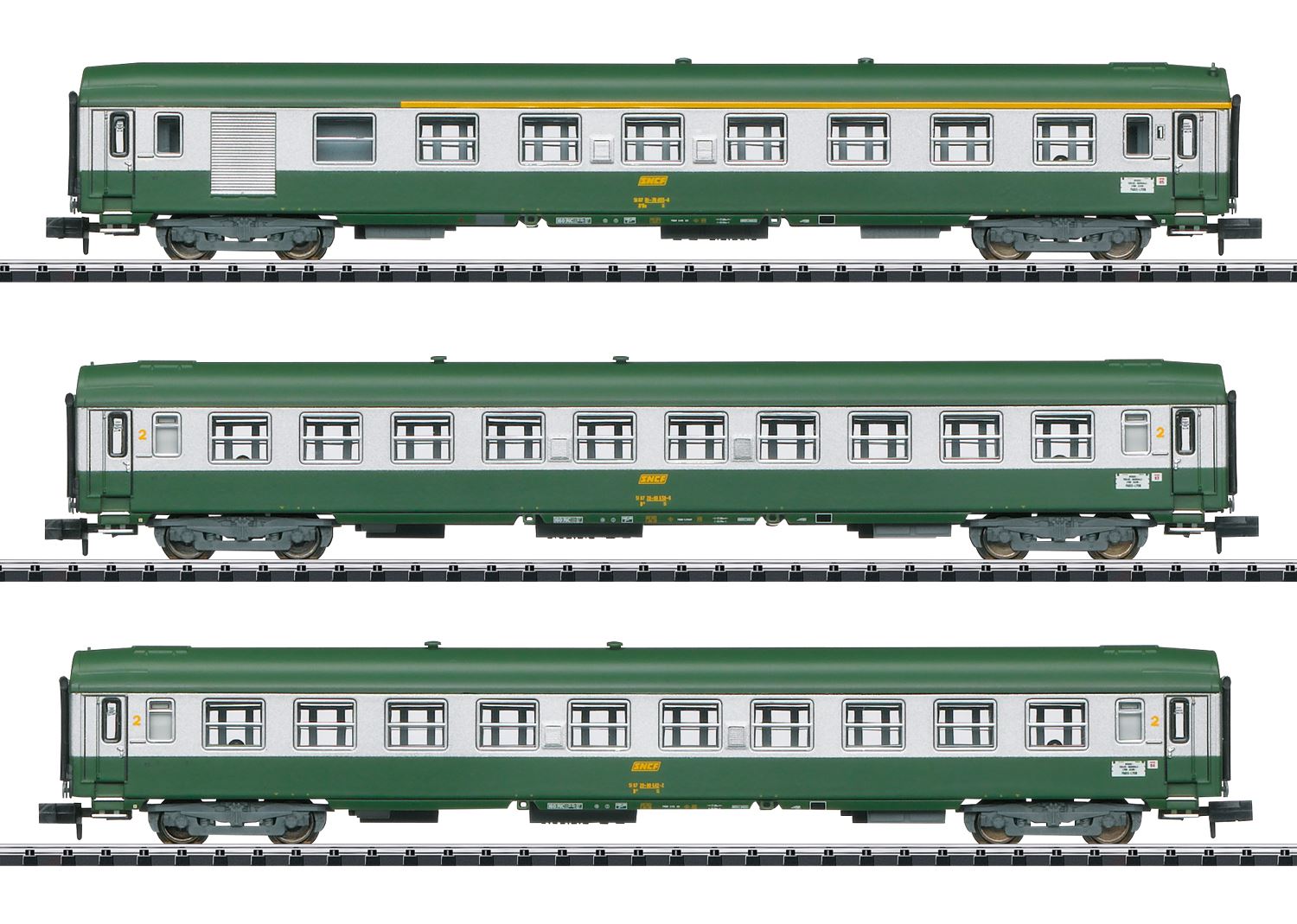 Vorbild: 2 Schnellzugwagen 2. Klasse (B10) und 1 Schnellzugwagen mit Gepäckabteil (A7Dd) der Französischen Staatseisenbahn (Société nationale des chemins de fer français / SNCF). Im Zustand von 1978 mit dem Zuglauf Nizza - Paris.<br>Modell: Mit Kinematik für Kurzkupplung. Vorbereitet für den nachträglichen Einbau einer Innenbeleuchtung.Gesamtlänge über Puffer 459 mm.<br><br>Die dazu passende Innenbeleuchtung:66616 LED-Innenbeleuchtung.
