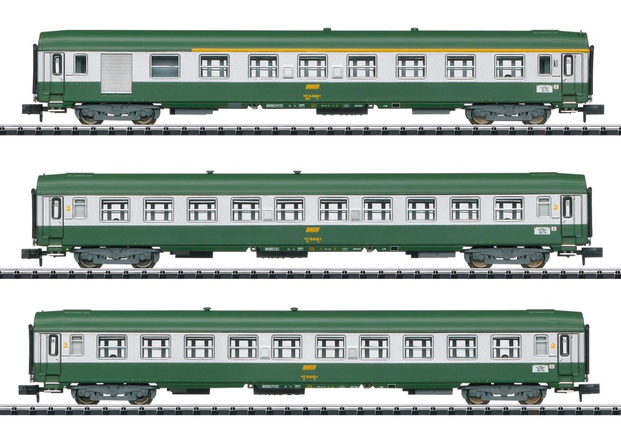 Vorbild: 2 Schnellzugwagen 2. Klasse (B10) und 1 Schnellzugwagen mit Gepäckabteil (A7Dd) der Französischen Staatseisenbahn (Société nationale des chemins de fer français / SNCF). Im Zustand von 1978 mit dem Zuglauf "Nizza - Paris".