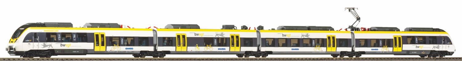 Neuheit 2023: Druckvariante des Elektrotriebwagens BR 442 "Talent 2" in 4-teiliger Ausführung im Design der SWEG Bwegt. Die Elektrotriebwagen BR 442 „Talent 2” - Vorbild des PIKO Modells - werden seit 2011 im Regionalverkehr der DB AG sowie bei privaten Eisenbahnverkehrsunternehmen in ganz Deutschland eingesetzt. Im Maßstab 1:160 werden die markanten Stirnpartien, die Drehgestellblenden, die Gehäuse und die aufwendig gestaltete Dachpartie vorbildgerecht nachgebildet. Der Antrieb wurde so untergebracht, dass auch in der kleinen Baugröße N ein nahezu freier Durchblick durch den Wagenkasten bestehen bleibt und trotzdem gute Fahreigenschaften gewährleistet sind. Für den unkomplizierten Einbau eines Digitaldecoders verfügt der Triebwagen über eine PluX12-Schnittstelle. Darüber hinaus ist das Modell für die Nachrüstung mit Sound vorbereitet.