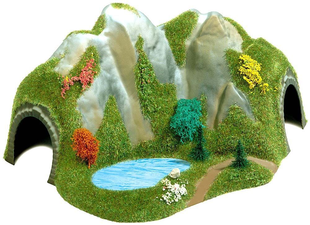 Mit See und steil aufragenden Felspartien für gebogene Strecken. Größe: 26 x 20 cm, 12 cm hoch.<br><br>Durch die spezielle Busch Grasimitation (gleiche Farb- und Materialstruktur wie Busch Geländeteppiche maigrün) ergeben sich Kombinationsmöglichkeiten mit selbstgestalteten Geländeabschnitten und mit anderen Busch Landschaftsteilen, Auffahrten usw.