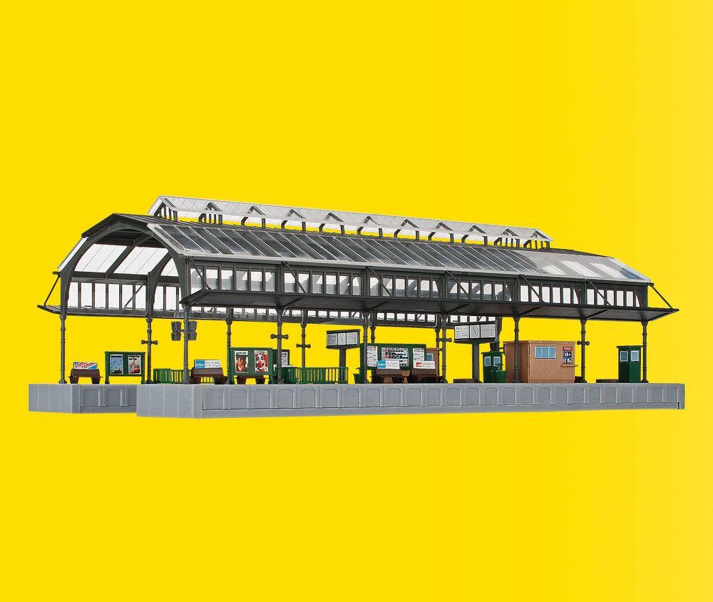 Bausatz. Gleise und Bahnsteige werden hier von einer interessanten Hallenkonstruktion aus Eisen und Glas raumwirksam überspannt. Mehrere Hallen können in beliebiger Länge und Breite hinter- bzw. nebeneinander aufgebaut werden, wobei sie je nach Wunsch oder vorhandener Anlage als Durchgangs- oder Kopfbahnhof eingesetzt werden können. Der Aufbau der gewölbten Dachkonstruktion bereitet im Modell keine Schwierigkeiten, lediglich die Montagereihenfolge der einzelnen Dachteile spielt eine Rolle.