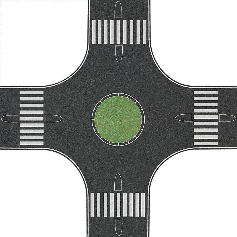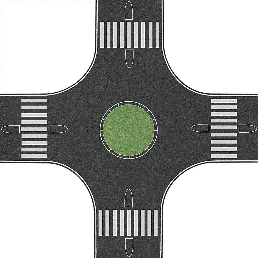 Selbstklebend. Gleiche Farb- und Materialstruktur wie die Asphaltstraßen. Mit Rasenfläche für den Innenkreis. Für 40 mm breite Straßen. 160 x 160 mm.