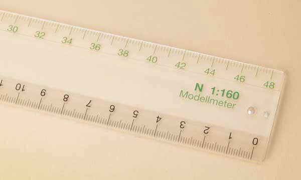 Für die maßstabsgetreue Nachbildung im Modell ist unser Lineal ein unverzichtbares Hilfsmittel. Mit Zentimeter- und Modellmeter-Einteilung.<br>30 cm Hersteller: Auhagen