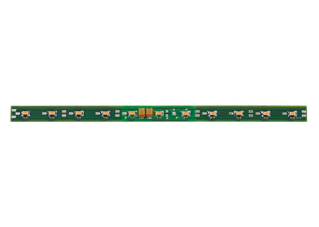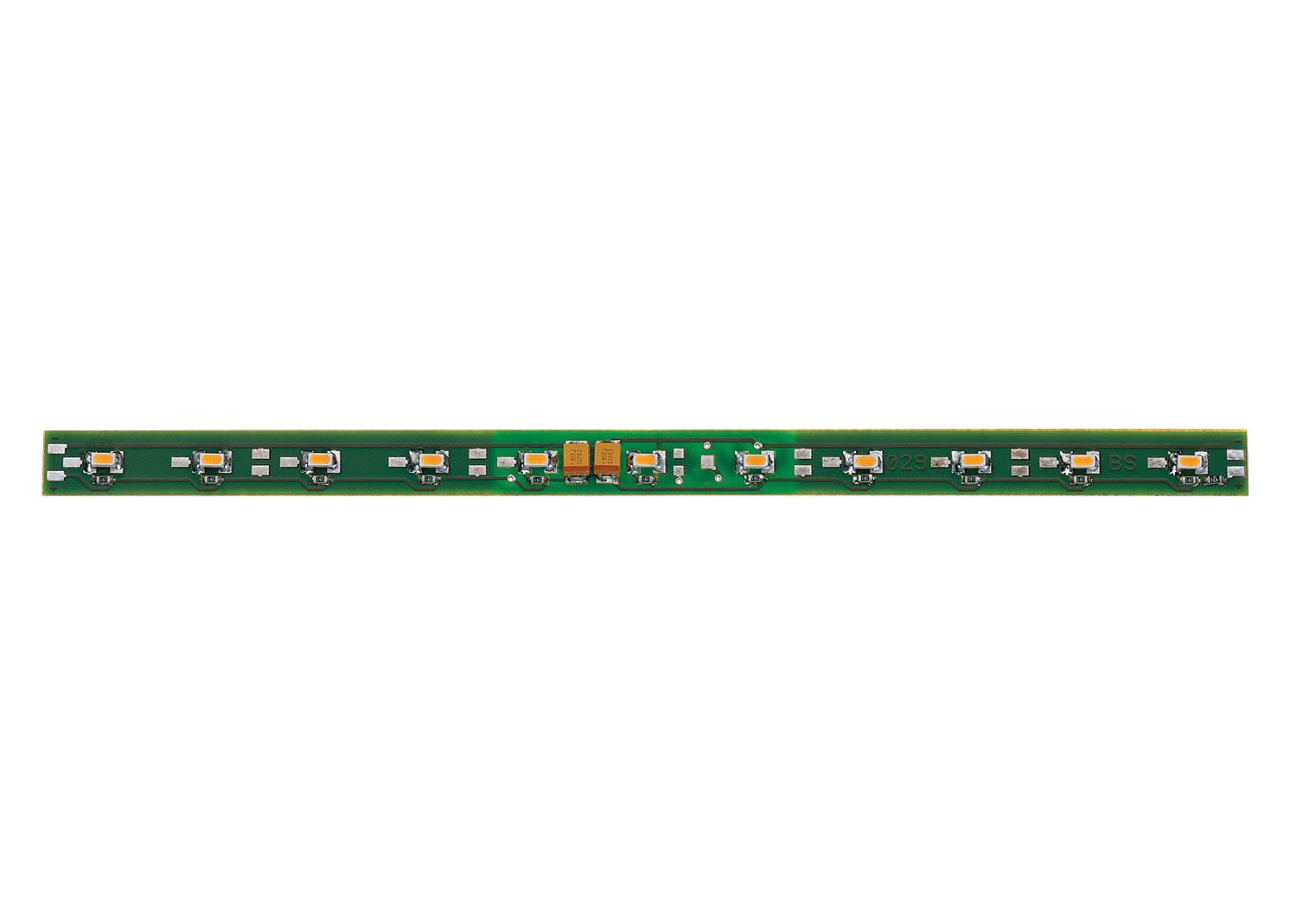 Für alle Minitrix Personenwagen mit Stromaufnahme von jeweils einem Leiter je Drehgestell. Bestehend aus einer kürzbaren LED-Lichtleiste (sunny-gelb, für frühere Epochen) und Schleiferfedern. Die LED-Lichtleiste ist mit einem Elko zur Energiepufferung (Flackerschutz) und einem Dimmer (Poti) ausgestattet.