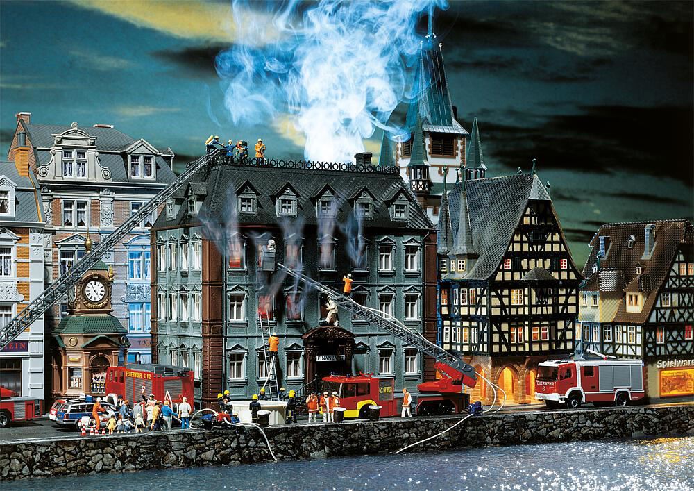 Das Besondere dieses Bausatzes: verwitterte, rauchgeschwärzte Fassade; inkl. Spezial-Rauchgenerator, (16 V, Wechselspannung) erzeugt dichten Qualm aus den Fensteröffnungen; Minilichteffekte Brandflackern (16 V, Wechselspannung) für effektvollen Feuerschein und Rauchöl zum Nachfüllen des Rauchgenerators.