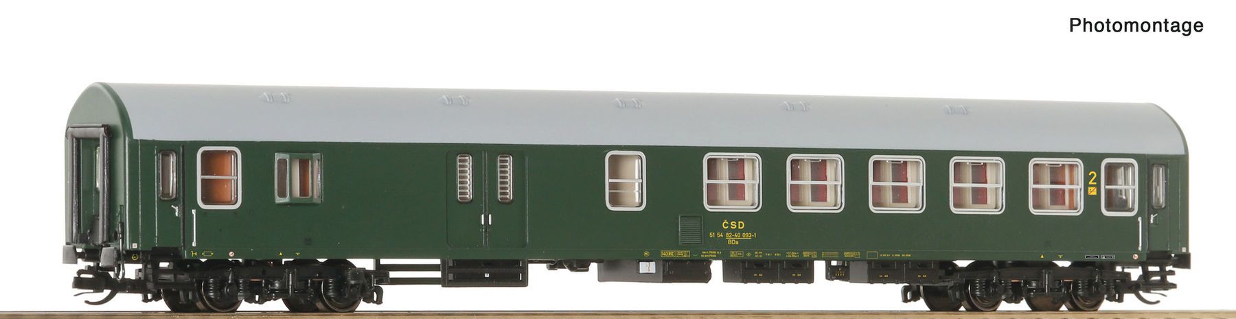 Abteilwagen 2. Klasse mit Gepäckabteil Bauart Y/B-70, Gattung BDa, der Tschechoslowakischen Staatsbahnen. Innenbeleuchtung nachrüstbar Artikelnummer 4080001 Mit Inneneinrichtung ausgestattet Schacht NEM 358 mit KK-Kinematik Länge über Puffer 204 mm Hersteller: Roco