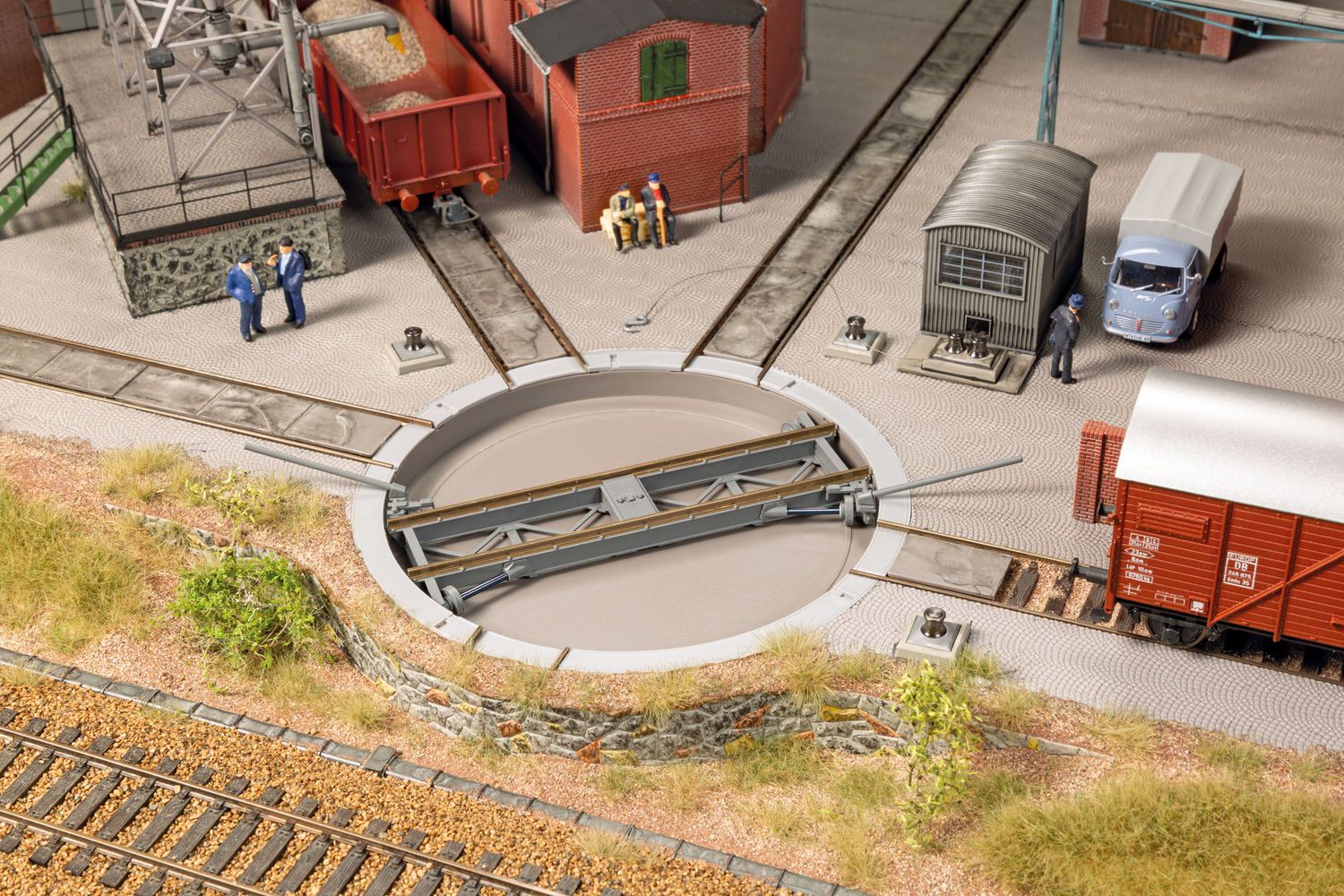 Auch im 2-Leiter-Bereich sorgt diese Drehscheibe für Bewegung im industriellen Umfeld. Sie ist für Waggons und kleinere Lokomotiven konzipiert und passt durch ihre kompakte Bauform auf viele Anlagen. <br>Die Bühne misst 95 mm, der Gesamtdurchmesser beträgt 111 mm. Mit Abgangswinkeln von 90 und 45 Grad lassen sich flexible<br>Gleisanordnungen umsetzen. Passend für Gleissysteme mit 2,07 mm Profilhöhe (z. B. Tillig). Antriebsmotor und Anschlusseinheit sind im Lieferumfang enthalten. Hersteller: Auhagen