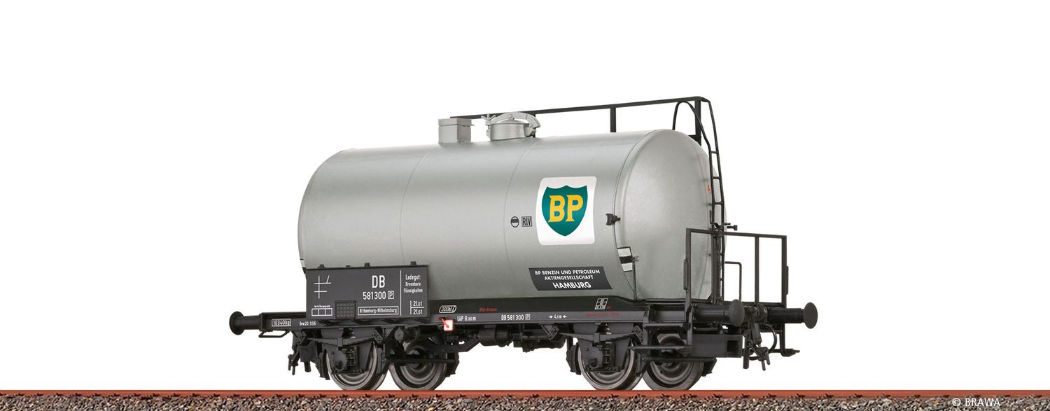 H0 Leichtbaukesselwagen Uerdingen Z [P] "BP" DB $Drehgestell mit Dreipunktlagerung$Extra angesetzte Achslagerdeckel$Extra angesetzte Federpakete$Extra angesetzte Bremsanlage$Fein gravierte Drehgestelle$Bremsbacken in Radebene$Extra angesetztes Achsbremsgestänge$Frei stehende Griffstangen Hersteller: Brawa