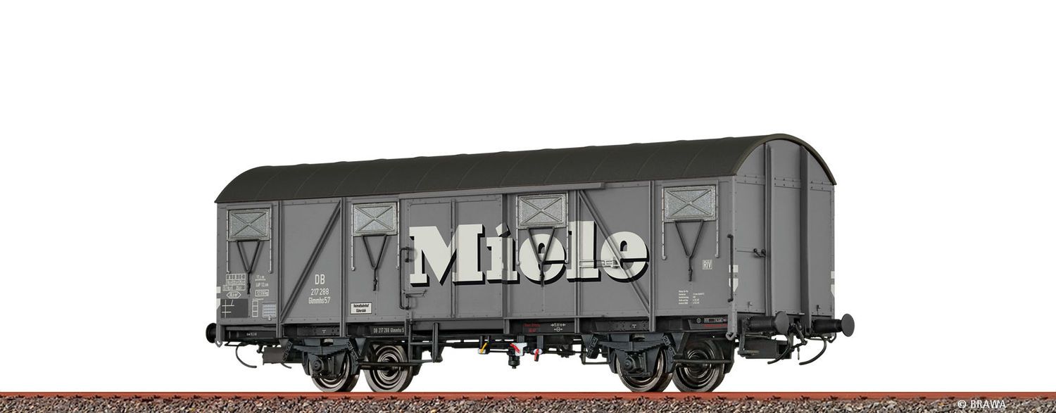 H0 Gedeckter Güterwagen Glmmhs57 "Miele" DB $Bremsbacken in Radebene$Drehgestell mit Dreipunktlagerung$Extra angesetztes Achsbremsgestänge$Extra angesetzte Bremsanlage$Maßstäblich schmaler Rahmen$Metallachshalter$Radsätze auch innen profiliert Hersteller: Brawa
