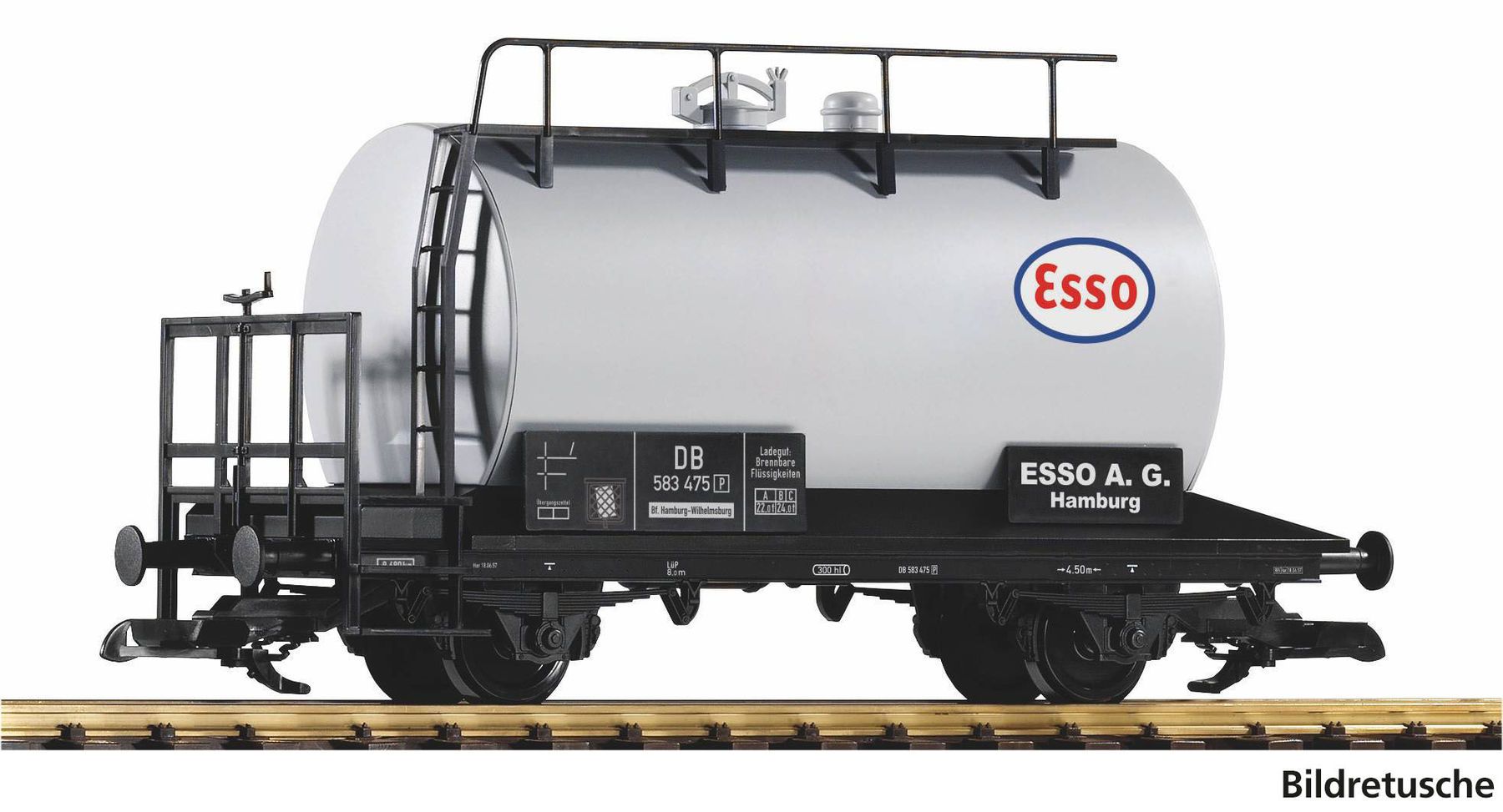 Länge über Puffer 350mm Mindestradius [mm]: 600 Neuheit 2025: Zweiachsiger Kesselwagen der DB mit ESSO Logo in Epoche III. Das Modell verfügt über eine Bremserbühne sowie freistehend montierte Leitern, Trittbretter und Handstangen. Hersteller: Piko