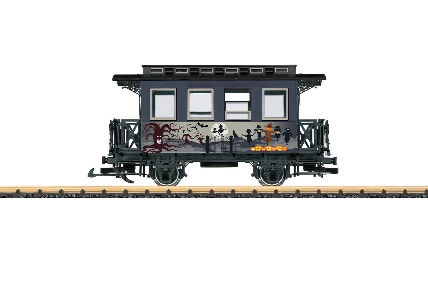 Modell eines zweiachsigen Personenwagens in der Gestaltung passend zu Halloween. Türen zum Öffnen, Metall-Scheibenradsätze. Länge über Puffer 30 cm.