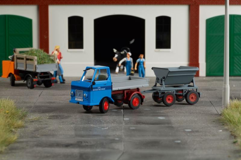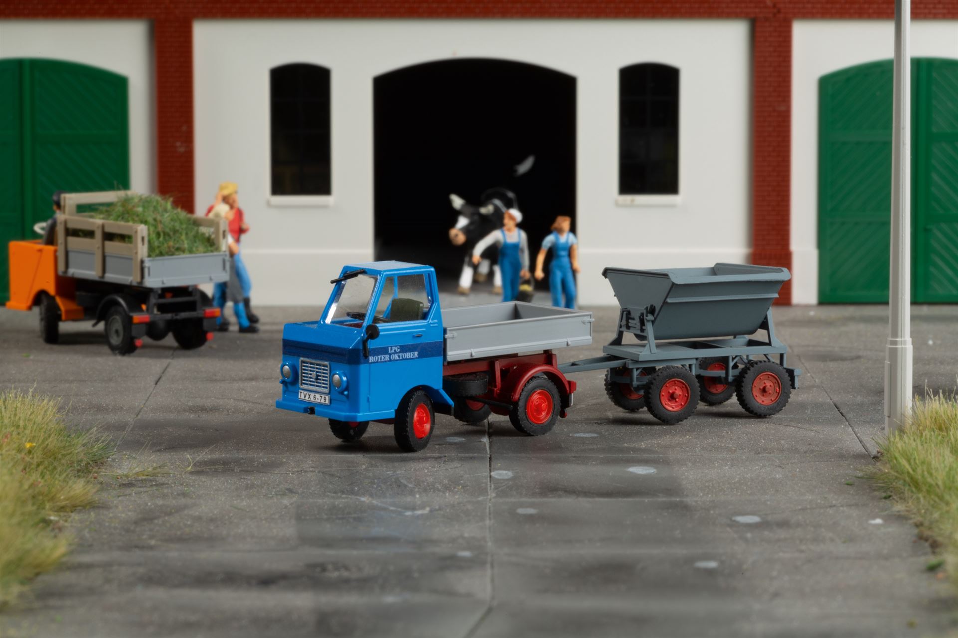 Landwirtschaft dient allen! Und der M22 dient der Landwirtschaft, im dekor der LPG "Rotes Banner" zieht er hier mühelos einenn Muldenkipper über den Hof. Masße Multicar: 39x15x22mm Kipplorenhänger: 35x19x19mm