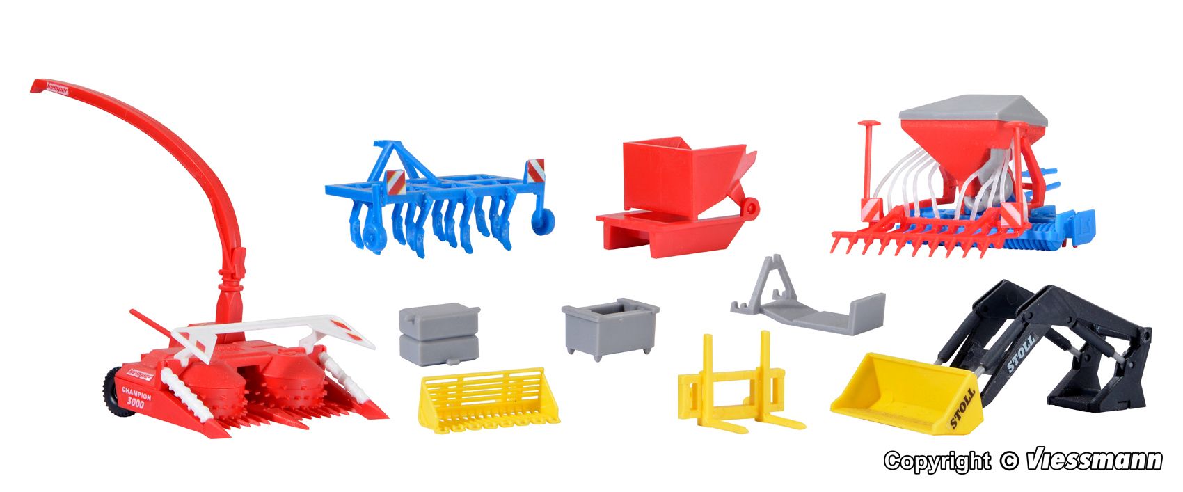 Bausatz. Bestehend aus Front- und Hecklader mit Staplergabeln, breiter Schaufel und Siloschaufel, Saatgutbunker, Ballastgewicht, Feldhäckslern, Frontgrubber und Drillmaschine.