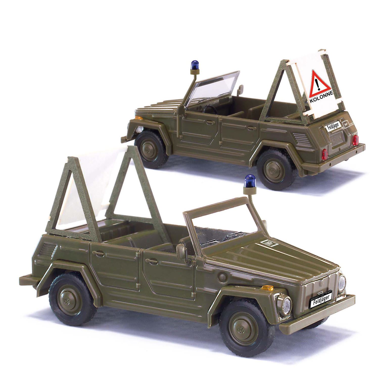 Der olivgrüne »Kübelwagen« der Bundeswehr-Feldjäger rückt aus für die Erledigung militärpolitischer Aufgaben. Hierbei wird in sechs Kernaufgaben und Spezialisierungen unterschieden. Zu den Kernaufgaben zählen: militärischer Ordnungsdienst, militärischer Verkehrsdienst, Sicherheitsaufgaben, Unterstützung von Gewahrsamsaufgaben, Unterstützung von Heimat-, Raum- und Objektschutz und Erhebungen und Ermittlungen. In den Bereich der Spezialisierungen fallen: Personen- und Begleitschutz, Eskorten- und Lotsendienst, Zugriffsdurchsuchungen, Ereignis-, Tatort- und Spurensicherung sowie Präzisionsschützen. Das 1:87er Modell zeigt einen Einsatz im Bereich der Kernaufgaben beim militärischen Verkehrsdienst, insbesondere die Begleitung einer Militärkolonne. So ist das Modell, wie sein großes Vorbild ebenfalls mit einem zusätzlichen Informationsschild ausgestattet