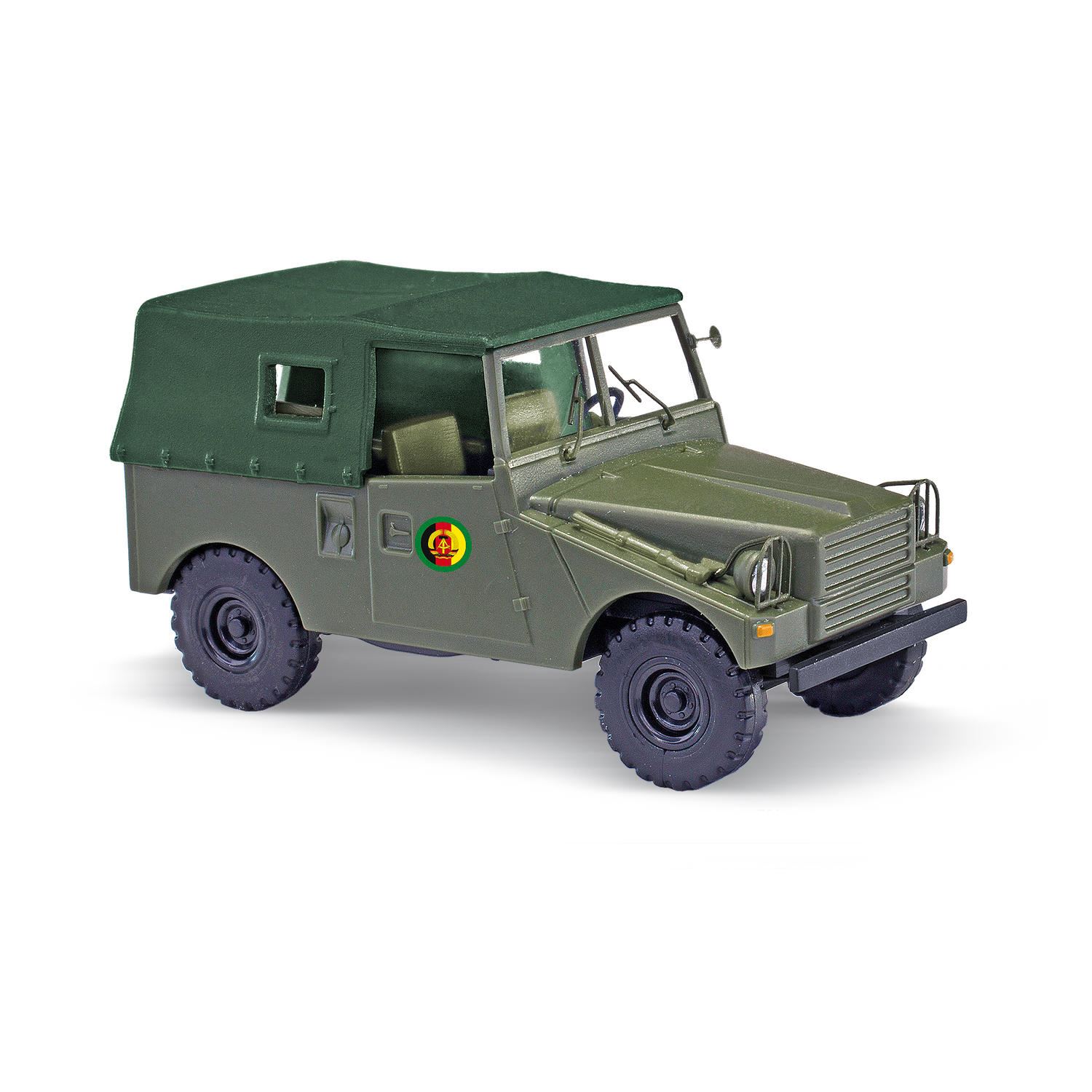Mattolivfarbenes, geländegängiges Patrouillenfahrzeug der DDR Grenztruppe. Die Grenztruppen unterstanden dem Ministerium für Nationale Verteidigung (MfNV) und waren eine eigenständige militärische Formation der bewaffneten Organe der DDR zur Sicherung der territorialen Integrität.