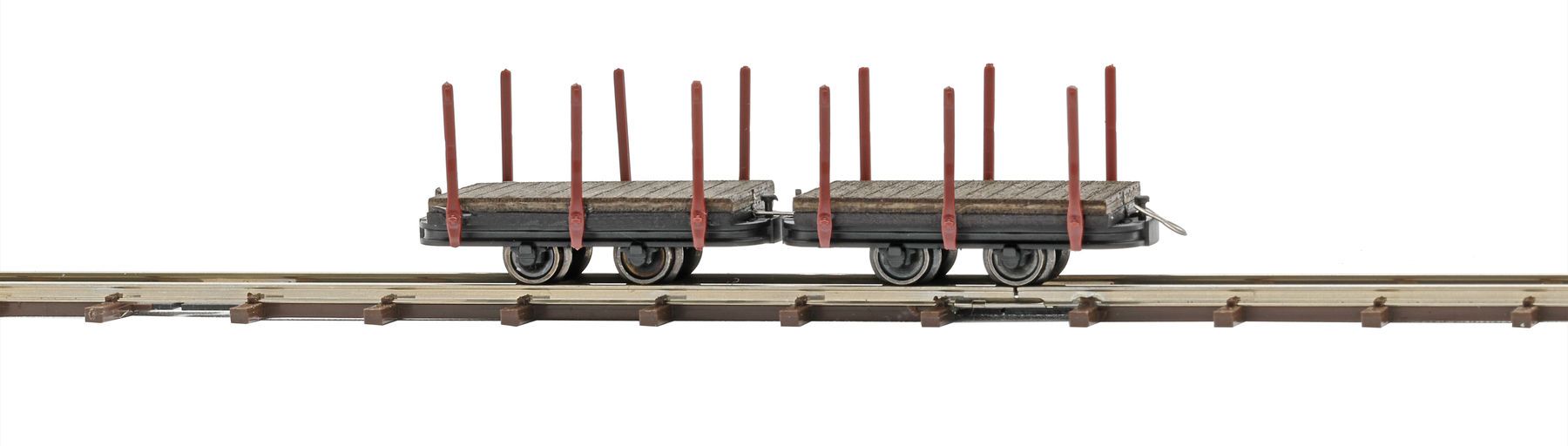 2 Einzelrungenwagen zum Transport von z.B. Kurzholz. Länge je Wagen: 29 mm.