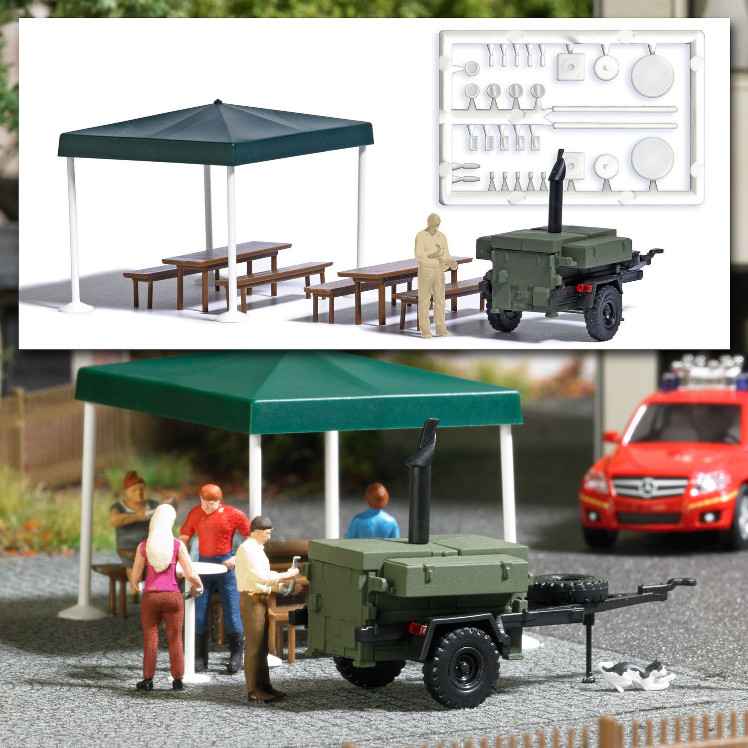 Bausatz für einen Einachsanhänger Typ HL 10.00 mit dem Aufbau einer so genannten »Gulaschkanone«. Auch als Feldküche einsetzbar. Mit Figur (unbemalt), Pavillon, Sitzgarnituren, Stehtischen und Geschirr. Länge des Anhängers: 47 mm