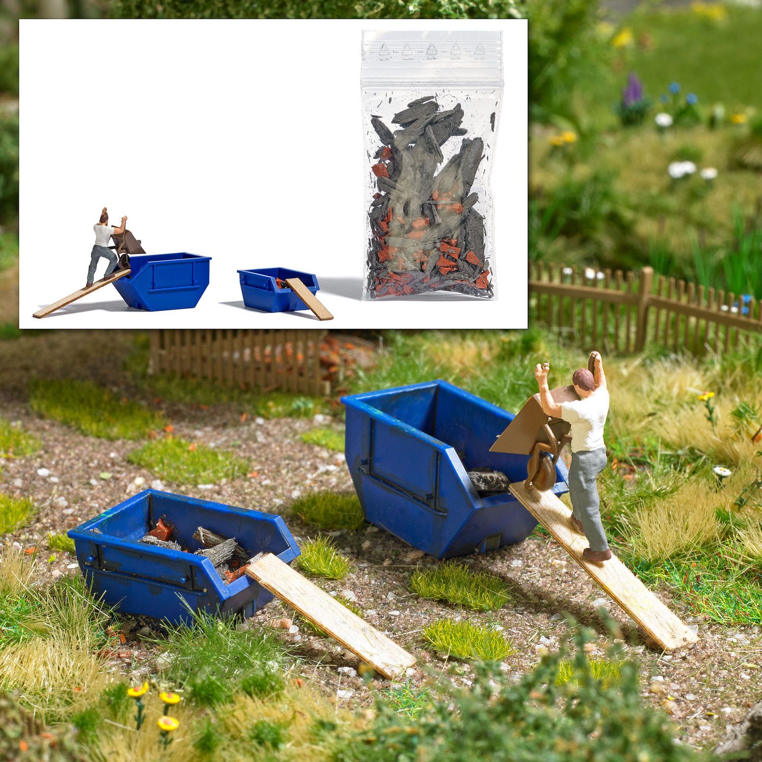 Action Set für die realistische Belebung Ihrer Modellwelt. Mit thematischem Zubehör und mindestens einer Figur (bemaltes Fertigmodell) in passender Position. Arbeiter, der Absetzmulden mit einem Schubkarren befüllt. Mit Absetzcontainer 1,5 m³ und Absetzcontainer 2,5 m³ sowie 2 Holzdielen und Bauschutt.