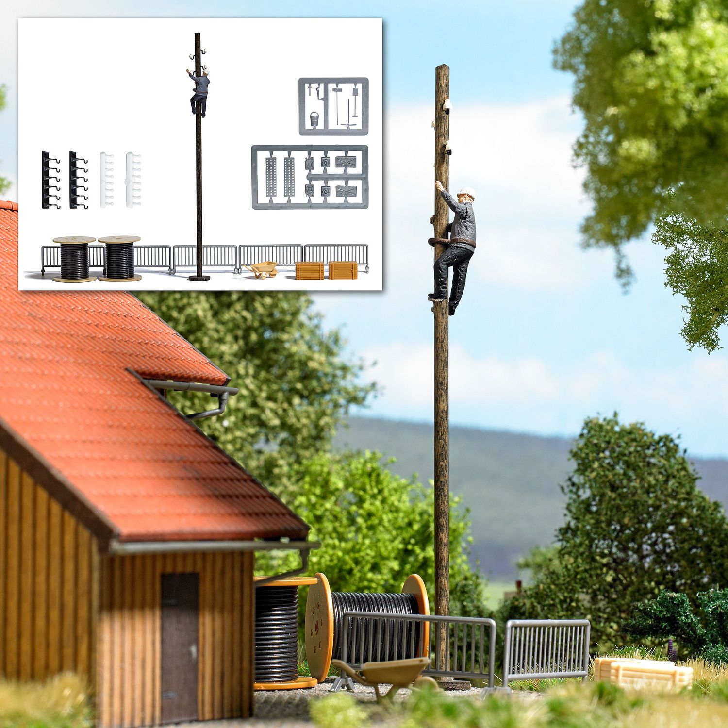 Action Set für die realistische Belebung Ihrer Modellwelt. Mit thematischem Zubehör und mindestens einer Figur (bemaltes Fertigmodell) in passender Position. Mastkletterer mit viel Zubehör für den Leitungsbau: Freileitungsmast aus echtem Holz, Isolatoren, Schubkarren, Werkzeug, Werkzeugkisten, Benzinkanister, Sandbleche, Kabelrollen, Holzkisten und Absperrungen.