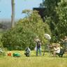 4 Fotografen in unterschiedlichen Positionen mit Kameras. Inkl. Studioscheinwerfer (ohne Funktion) und viel Zubehör zur Dekoration von Fotoshootings: Holzkisten, Vogelscheuche, Parkbänke, Kleintiere, Aliens und Blumen. Passende Models zur Ergänzung: H0 79811, H0 79812 und H0 79850.