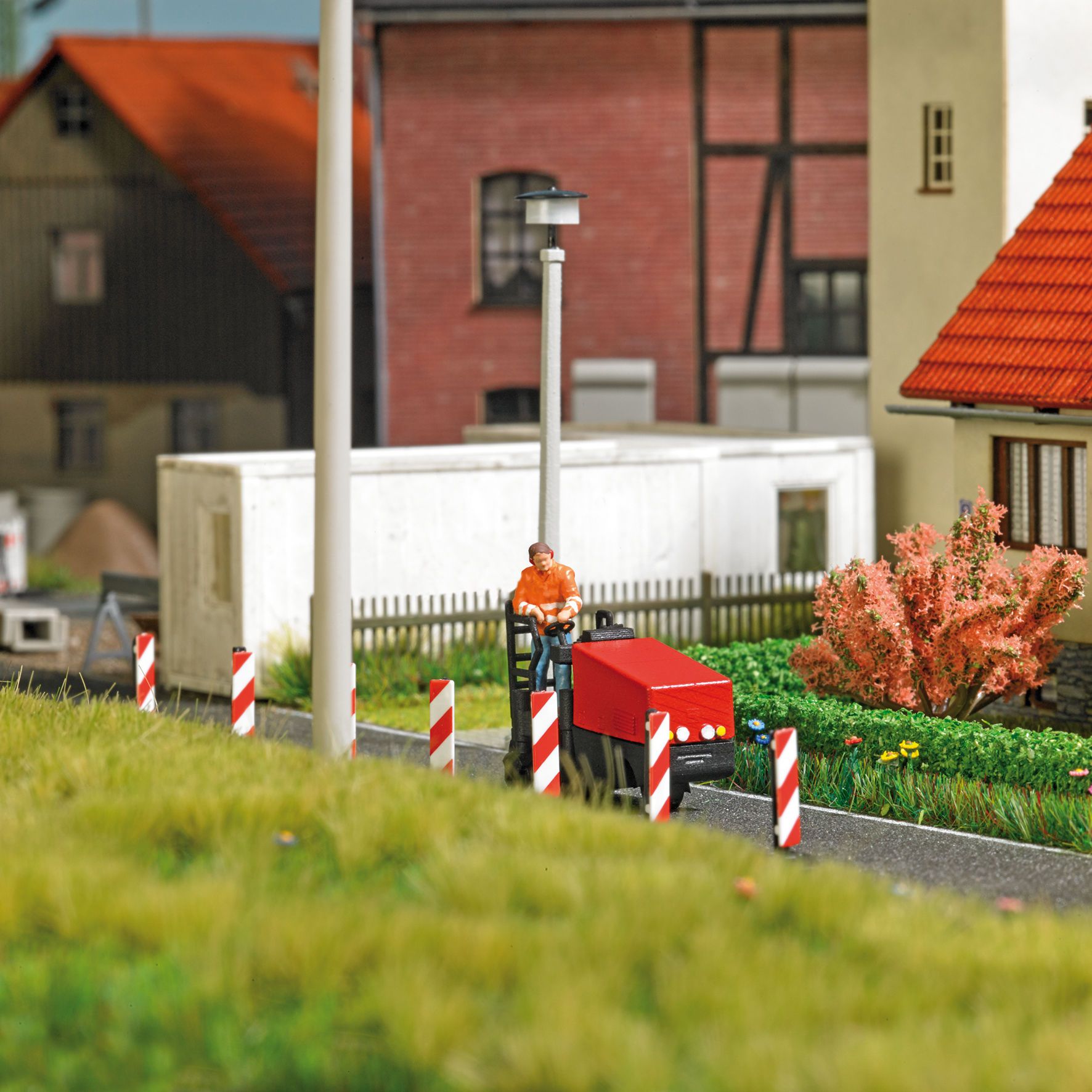 Bevor die neue Asphaltdecke aufgezogen werden kann, muss die alte Decke runter. Action Set mit Fahrer, Asphaltfräse und 7 Warnbaken.