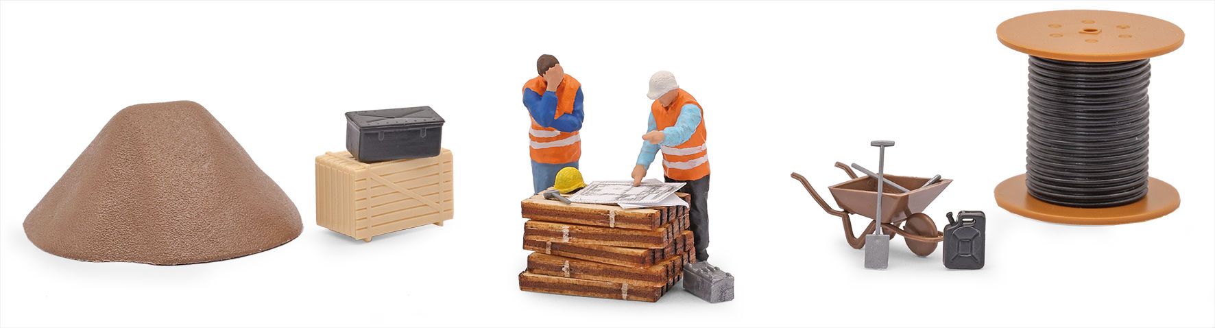 Wenn der Bauherr andere Ideen hat… Action Set mit Bauherr und Bauleiter, Paletten, Kisten, Werkzeugkasten und Werkzeug, Kanister, Schubkarre, Kabeltrommel, Sandhaufen und Ausschneidebogen Bauplan.