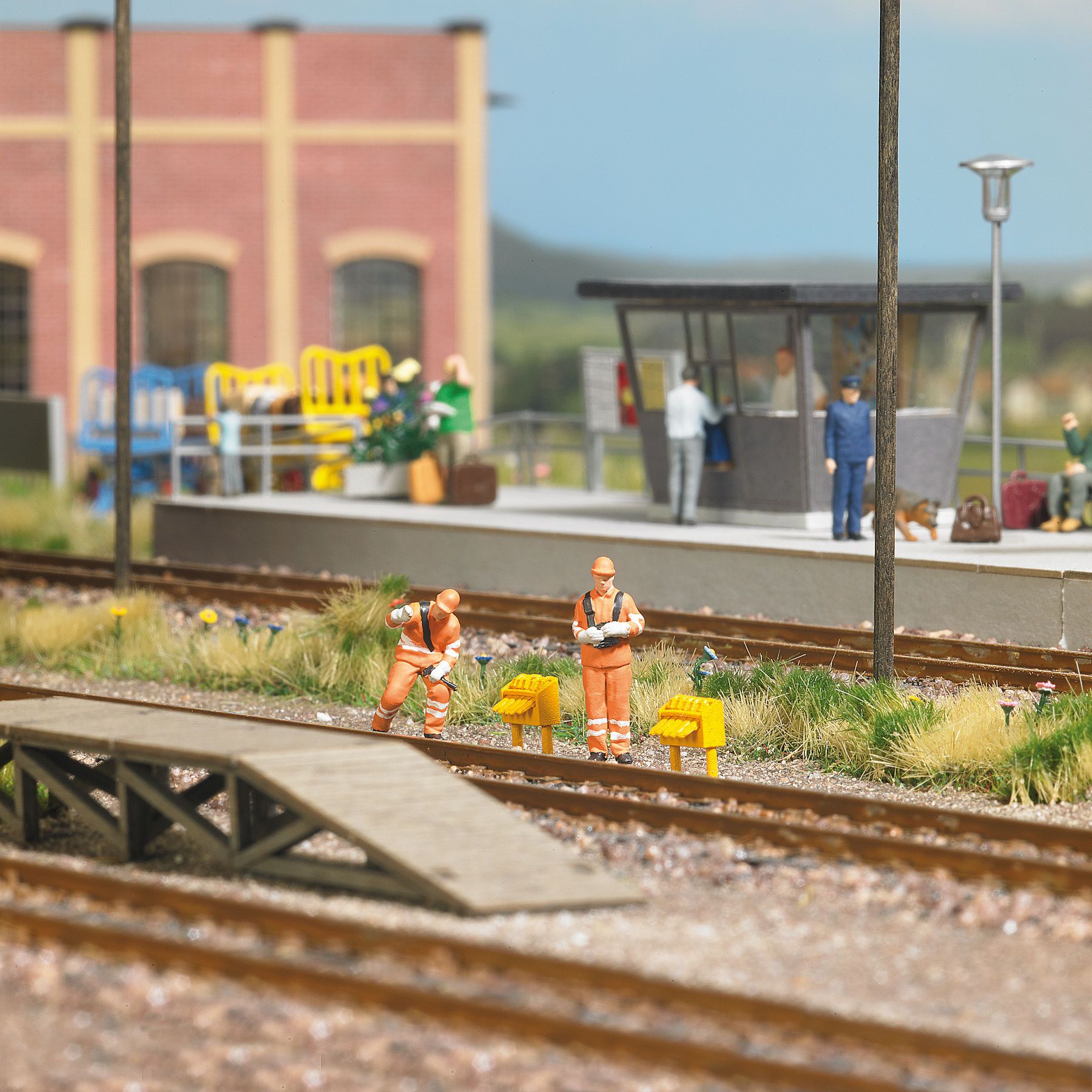 Rangierer mit Fernsteuerung und Wagenmeister bei der Wagenkontrolle in Arbeitskleidung der Epoche 5-6. Action Set inklusive 2 Hemmschuhständer für die weitere Ausgestaltung.