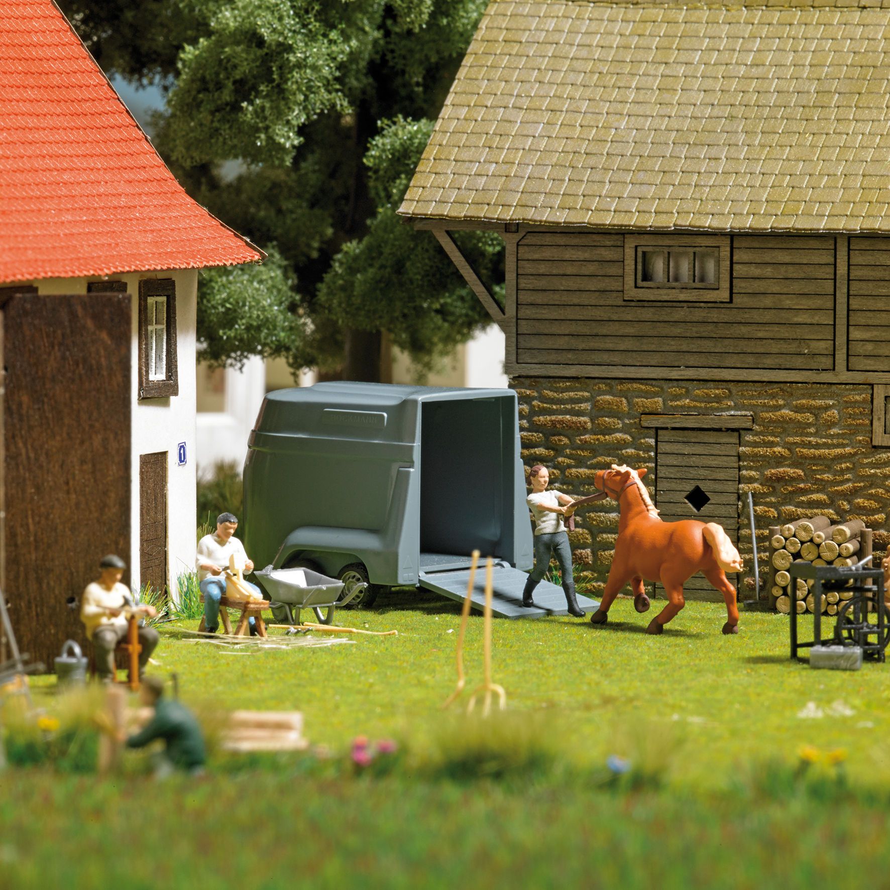 Auf keinen Fall rein in den Anhänger, lieber auf der Weide bleiben! Action Set mit Pony, Reiterin, Pferdeanhänger, 6 Heuballen und Stallwerkzeug.