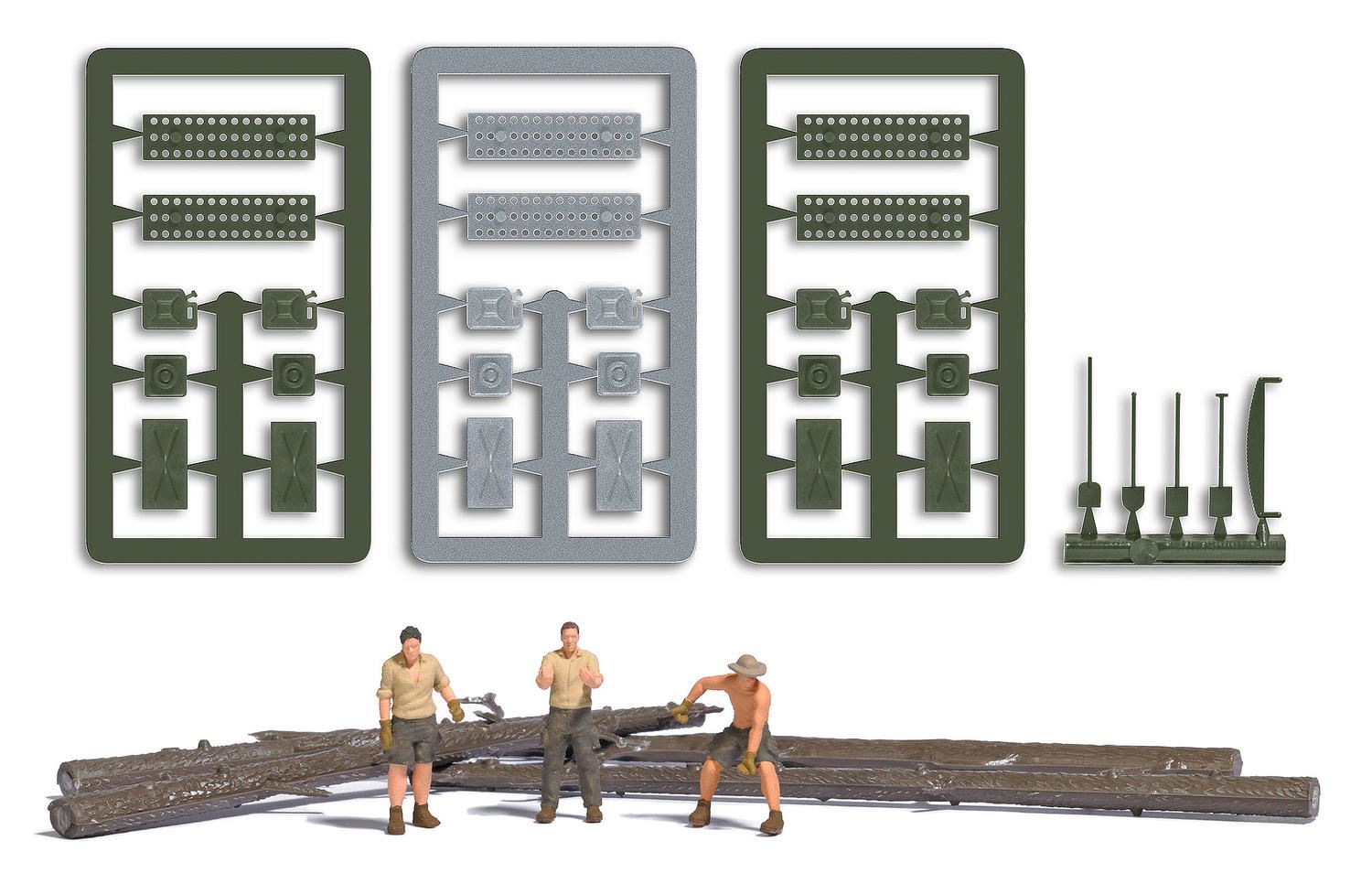 3 Teamworker, die den Trail für eine anspruchsvolle Offroad-Fahrt vorbereiten. Mit 4 Baumstämmen, Werkzeugen und jeweils 6 Kanistern, Werkzeugkisten und Sandblechen.