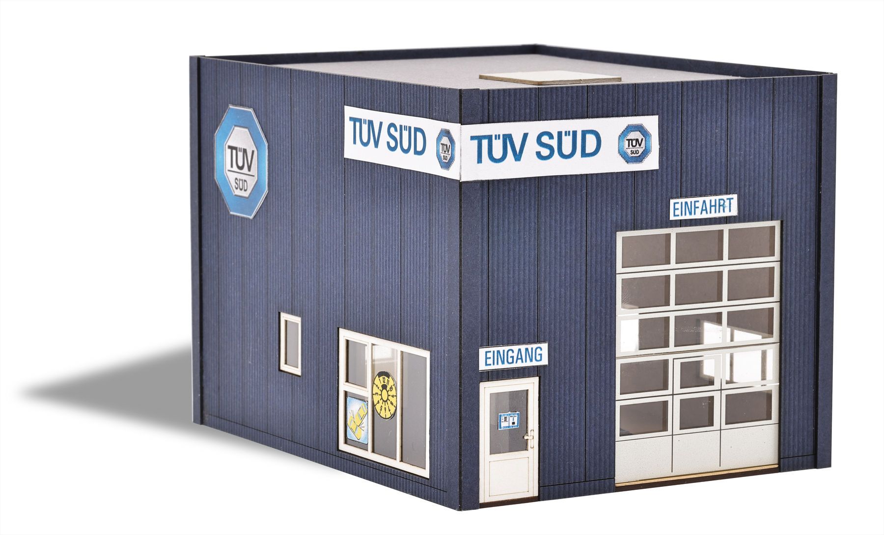 Bausatz für eine standardisierte, moderne Kfz-Halle mit großem Rolltor, Eingangstür und Fenster auf allen Gebäudeseiten. Im Innenbereich befindet sich eine Hebebühne. Inkl. Ausschneidebogen mit thematischen Schildern. Größe: 115 x 91 mm, 83 mm hoch.