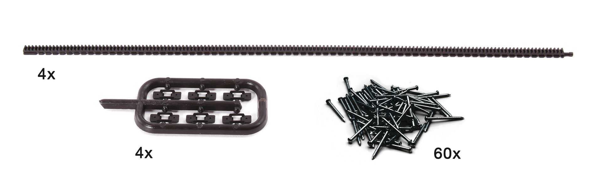 Länge: 230 mm (je Zahnstange). Flexibler Einbau in gerade und gebogene Gleise möglich Verwendbar ab Radius 2 (r= 358 mm) 4 Stück Zahnstangenelemente 24 Stück Befestigungsstühle Befestigungsnägel Hersteller: Roco