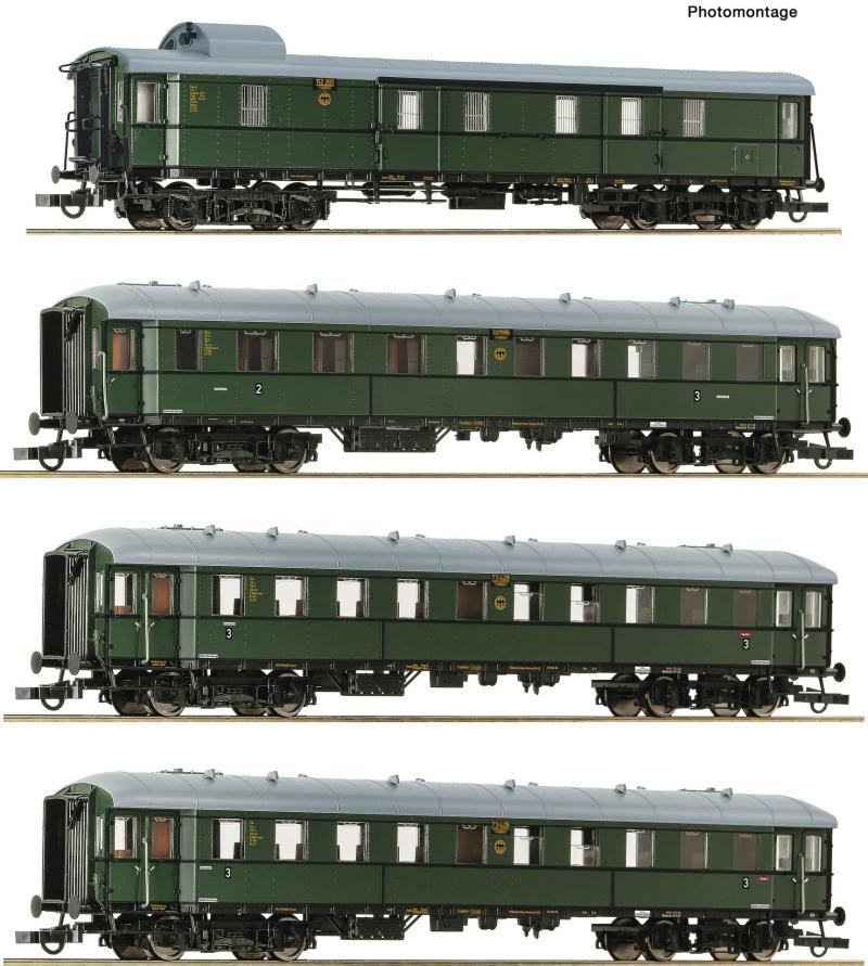 Wagenset 1 mit vier Reisezugwagen für den Traditions-Eilzug der Deutschen Reichsbahn Bestehend aus einem Gepäckwagen, Gattung Pw4ü, einem Wagen 2./3. Klasse, Gattung BC4ü und zwei Wagen 3. Klasse, Gattung C4ü. ■ Mit beiliegenden Zuglaufschildern verschiedener Zugläufe Technische Daten: Allgemeine Daten Innenbeleuchtung nachrüstbar Artikelnummer 40420, 6452 Mit Inneneinrichtung ausgestattet Schacht NEM 362 mit KK-Kinematik AC Radsatz Artikelnummer 40196, 6560 US Netzteil Zwickauer Abmessungen Länge über Puffer 949 mm