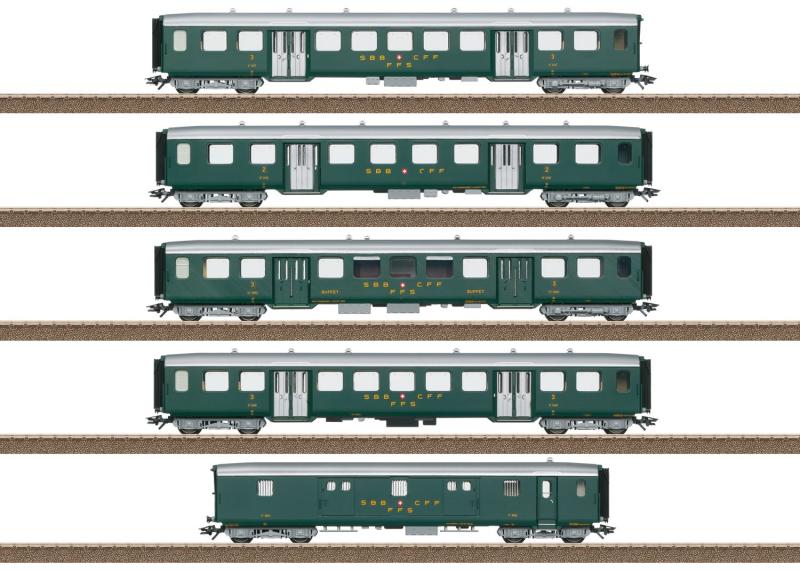 Vorbild: 5 verschiedene Leichtstahlwagen unterschiedlicher Bauarten, in der Ausführung der Schweizerischen Bundesbahnen (SBB). 2 Leichtstahlwagen C4, 3. Klasse. 1 Leichtstahlwagen B4, 2. Klasse. 1 Leichtstahlwagen Cr4, 3. Klasse mit Buffet-Bereich. 1 Leichtstahl-Gepäckwagen F4. Für den Einsatz in Leichtschnellzügen im Flachland auf der Strecke Genf-Bern-Zürich. Alle Wagen in tannengrüner Grundfarbgebung. Betriebszustand um 1950.<br>Modell: Befahrbarer Mindestradius 360 mm. Alle Wagen mit serienmäßig eingebauter Innenbeleuchtung mit warmweißen Leuchtdioden (LED). Lange Faltenbälge zum Auswechseln gegen die an den Enden des Wagen-Verbandes montierten kurzen Faltenbälge liegen bei. Gesamtlänge über Puffer 126 cm.<br><br>Die passende Elektrolokomotive Ae 3/6 I finden Sie im Trix H0-Sortiment unter der Artikelnummer 25360.<br><br>Dieses Leichtstahlagen-Set finden Sie in Wechselstromausführung im Märklin H0-Sortiment unter der Artikelnummer 43369.