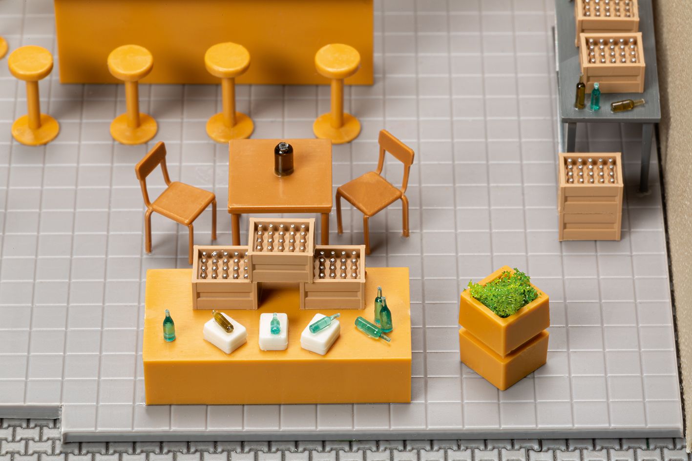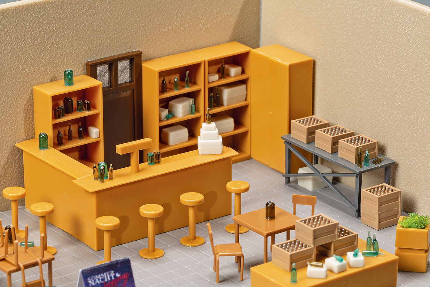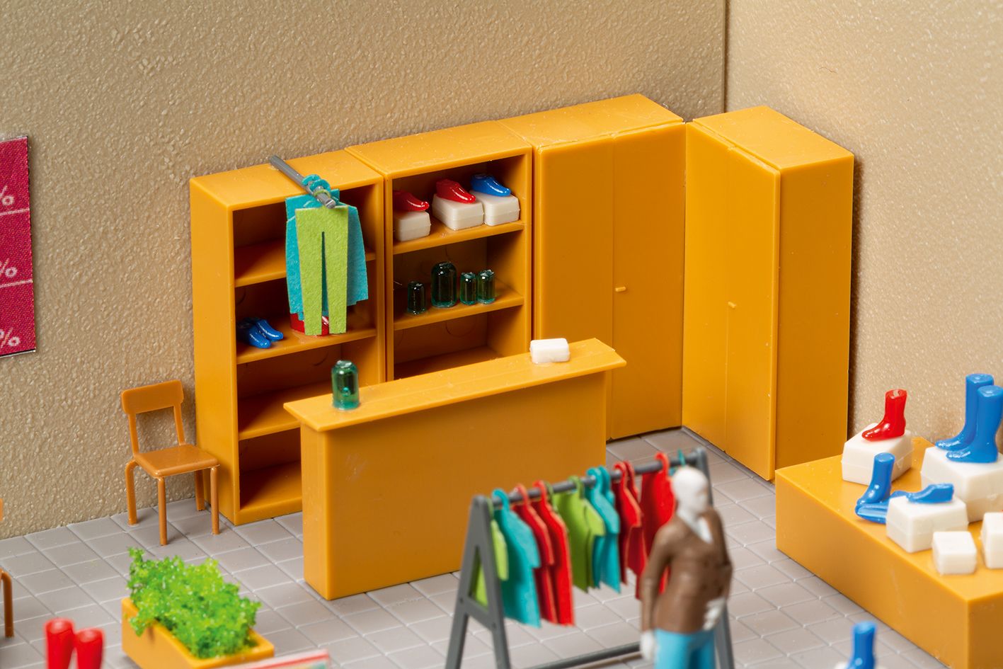 Ideal zur Ausgestaltung von Läden und Verkaufsräumen. Besonders passend für unsere Modelle der Schmidtstraße, lässt sich mit diesem Set eine realitätsnahe Inneneinrichtung gestalten. Die Ausstattung ist vielfältig: Neben Tresen, Schränken, Tischen und Stühlen gehören auch zahlreiche Details wie Flaschen, Pakete und Blumenkübel zum Lieferumfang. Für den Modeeinzelhandel liegen Kleiderständer, Kleidung zum Aufhängen sowie Schuhe bei. Ein besonderes Highlight sind die beiliegenden Schaufensterpuppen aus dem 3-D-Drucker, die für eine moderne und plastische Darstellung im Schaufenster sorgen. Ob Kaufhaus, Boutique oder kleiner Tante-Emma-Laden - mit diesem Set entsteht schnell ein lebendiges Ladenambiente mit viel Vorbildnähe.