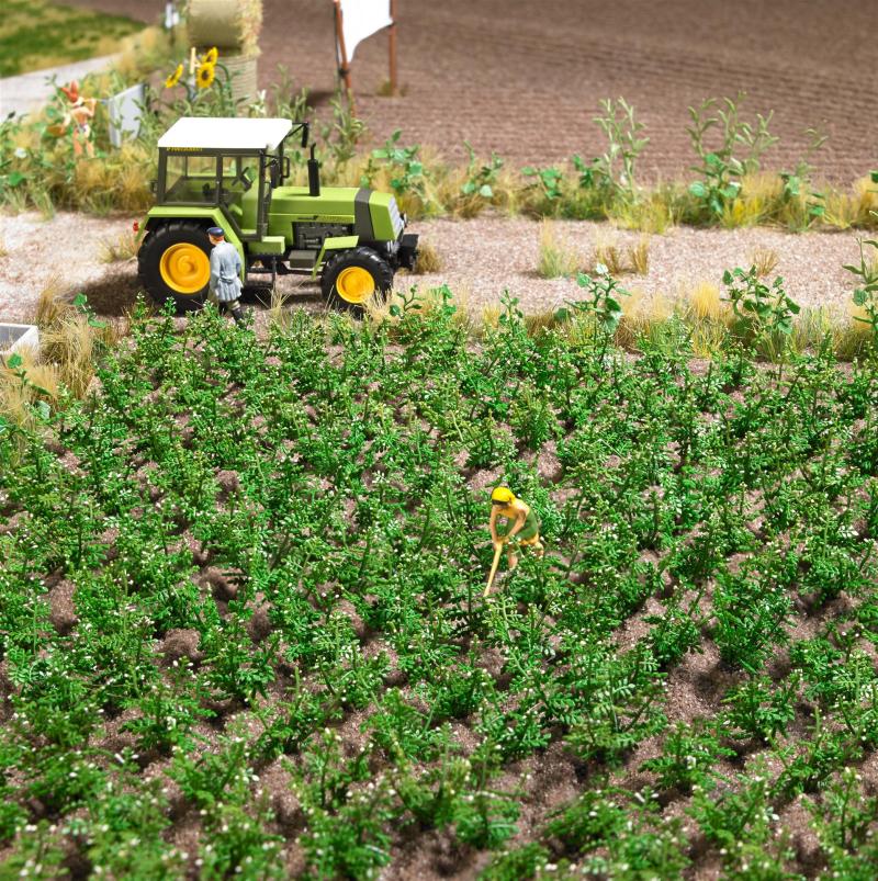 Bausatz für 30 Kartoffelpflanzen mit filigranem Blattwerk. Inklusive Grundplatten zum Aneinanderreihen in »Ackerform«. <br><br>Busch hat die »Kartoffeln« in modellgerechte 3-D-Pflanzen umgesetzt, die aus einem natürlich matt glänzenden Kunststoffmaterial in realistischen Farbtönen hergestellt werden.