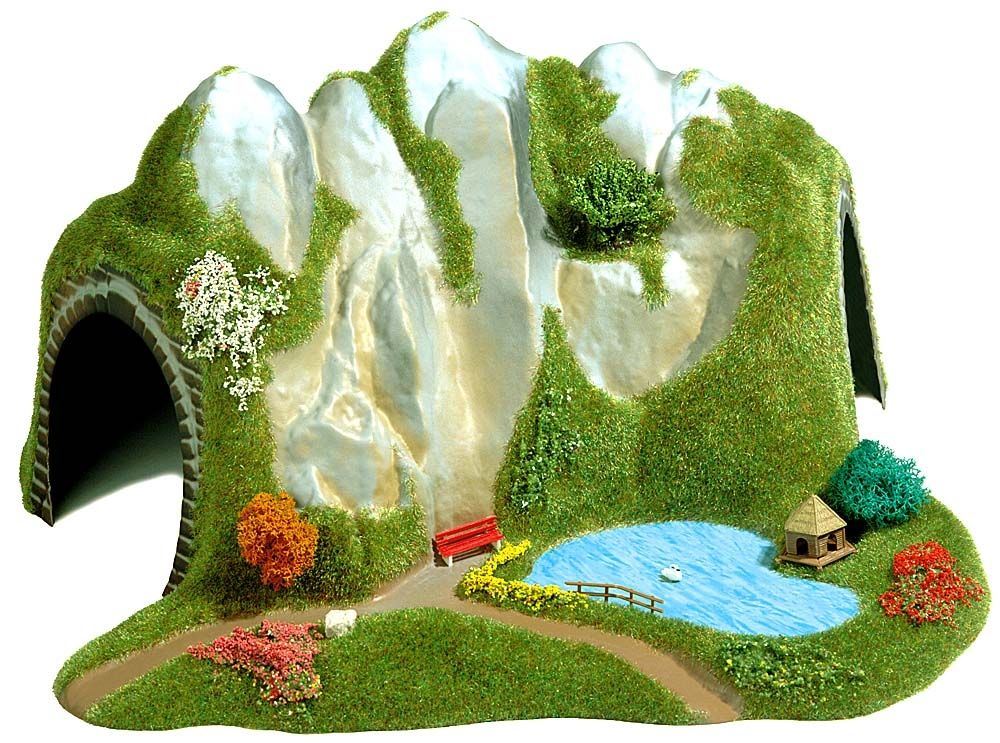 Mit See, Schwanenhaus und vielfältiger Ausstattung für gebogene Strecken<br><br>Für Gleise mit Radien von 350-400 mm<br>Maximale Innenhöhe des Portals: 92 mm<br>Größe: 32 x 32 cm, 18 cm hoch<br><br>Durch die spezielle Busch Grasimitation (gleiche Farb- und Materialstruktur wie Busch Geländeteppiche maigrün) ergeben sich Kombinationsmöglichkeiten mit selbstgestalteten Geländeabschnitten und mit anderen Busch Landschaftsteilen, Auffahrten usw.