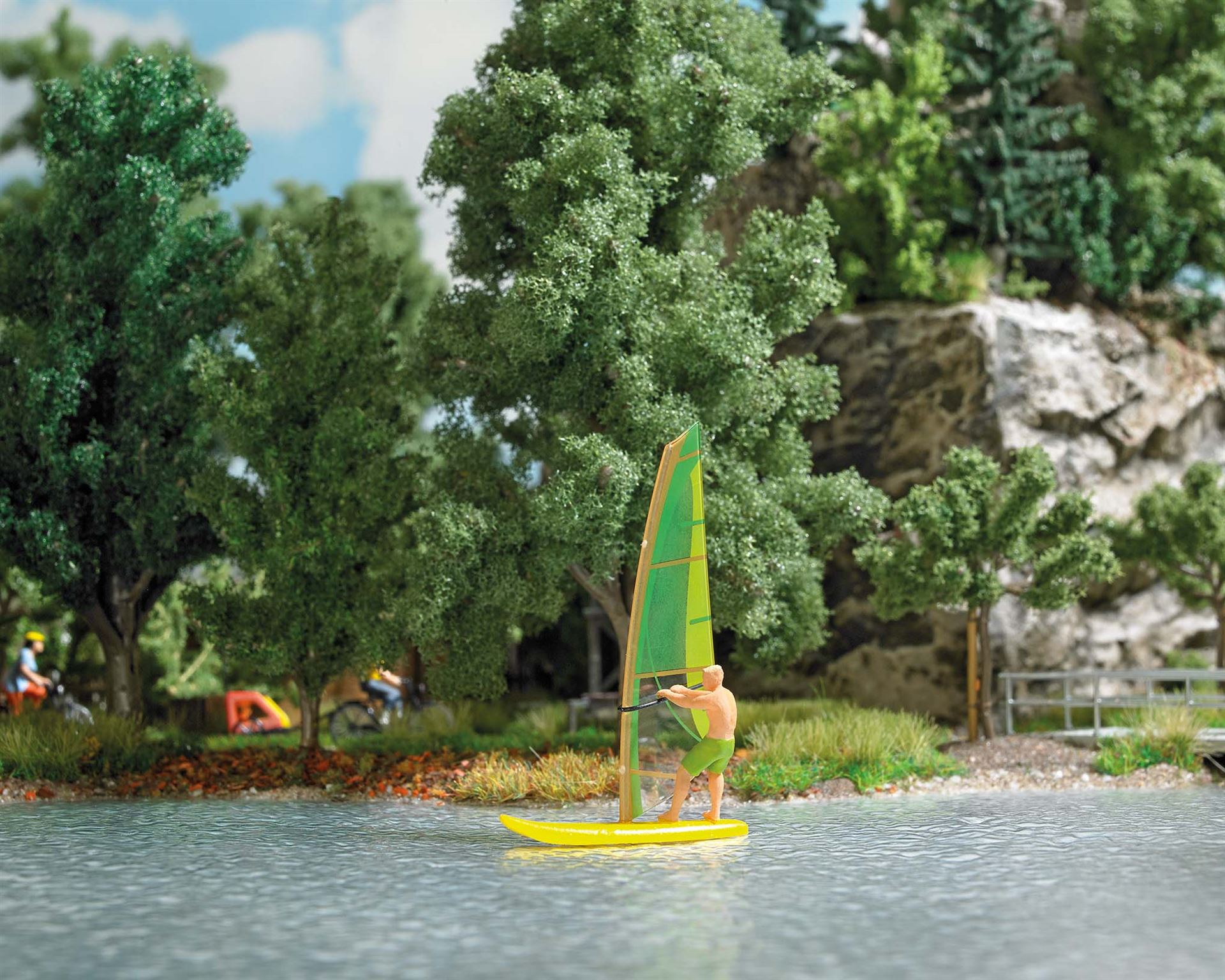 Wie von Geisterhand dreht der sportliche Windsurfer auf dem See seine Runden. Das Geheimnis liegt in dem Antrieb, der durch ein ausgeklügeltes Transmissionssystem erfolgt, wobei sogar die Wellenbewegungen simuliert werden. Bausatz mit Motor (zum Anschluss an 14 - 16 V Wechselspannung), Antriebskette, Antriebskasten und Surfbrett mit Segel und Windsurfer. Grundfläche 260 x 180 mm.
