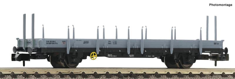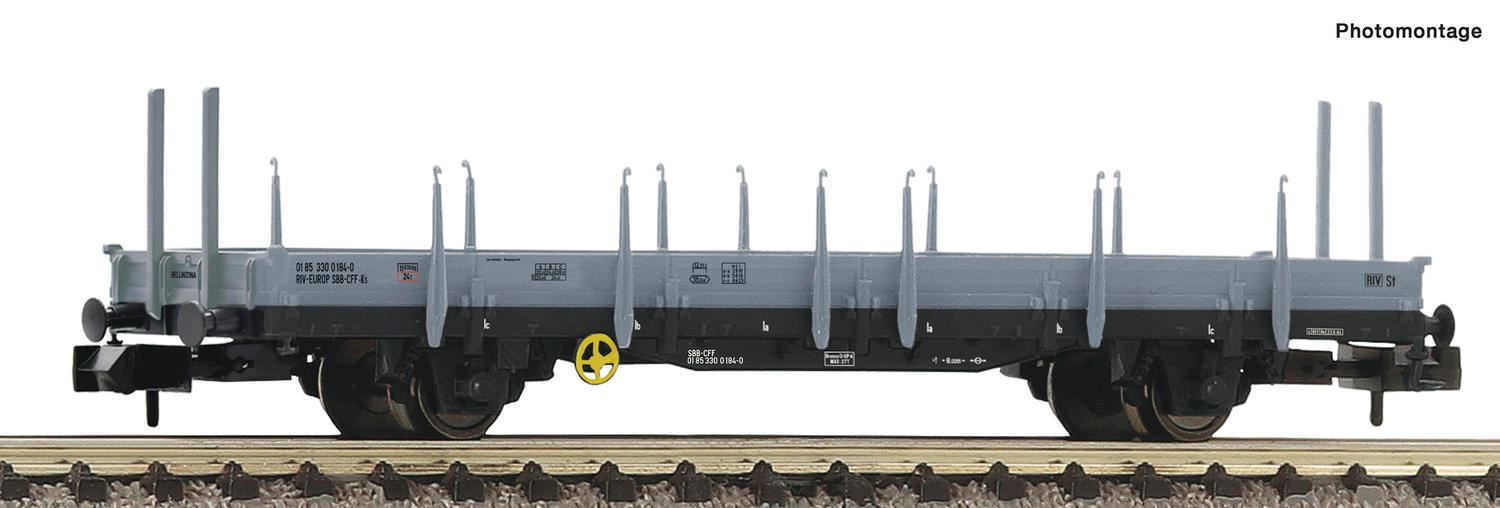 Mit schwarzem Fahrwerk und runden Puffern Die Schweizerischen Bundesbahnen beschafften die Rungenwagen Typ M5/Ks-w, später Ks 330, von 1959 bis 1970 in sieben Baulosen. Rungenwagen sind hauptsächlich für den Transport von sperrigen Gütern vorgesehen. Dazu zählen beispielsweise Stahl, Holz, große Maschinen und Kraftfahrzeuge sowie Baufertigteile und schwere Einzellasten. Außerdem werden sie zur Beförderung von Erdreich und Kies verwendet. Technische Daten: Allgemeine Daten Schacht NEM 355 mit KK-Kinematik Abmessungen Länge über Puffer 86 mm Hersteller: Fleischmann