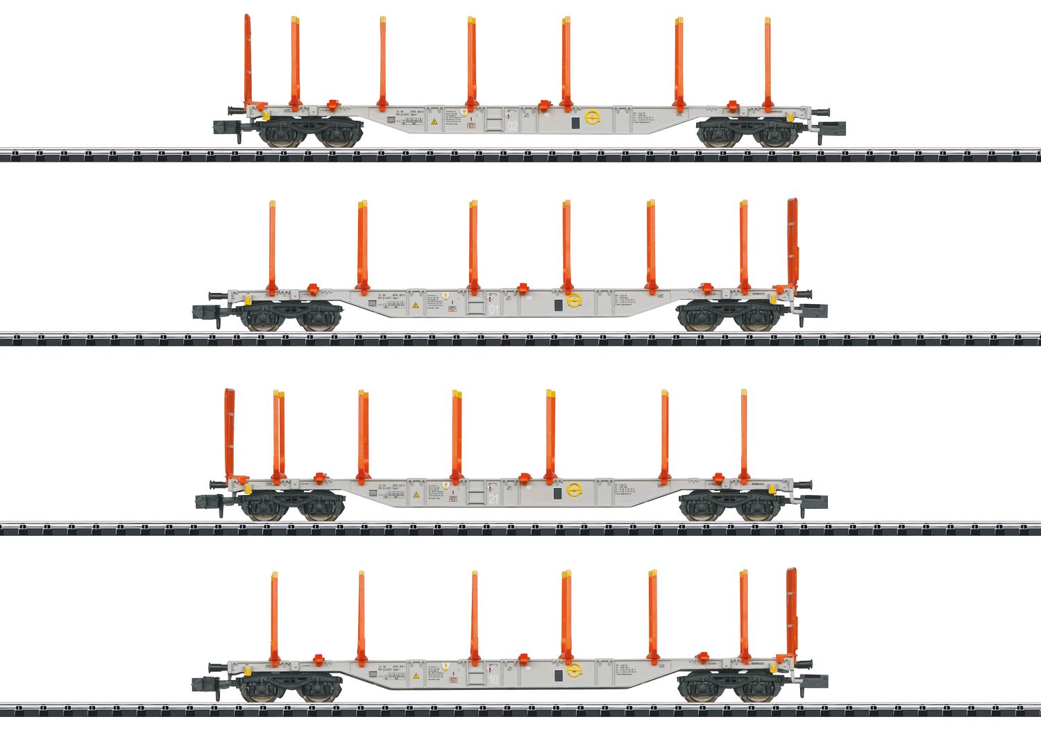 Vorbild: 4 vierachsige KLV-Tragwagen der Bauart Sgns 121 in seidengrauer Grundfarbgebung. Privatwagen der AAE Cargo AG, vermietet an Hector Rail AB, SE-Danderyd. Mit Holzladegestellen ExTe SR12, Stützschwellen und Stirnwandgitter, zum Transport von Stammholz. Betriebszustand 2014. Modell: Formvariante, Fahrgestell aus Metalldruckguss, Drehgestelle Typ Y 25, mit Kinematik für Kurzkupplung. Jeder Tragwagen ist mit 6 ExTe-Rungen SR12, 3 Stützschwellen und 1 Stirnwandgitter ausgestattet. Diese Wagen sind paarweise separat verpackt. Gesamtlänge über Puffer 492 mm.