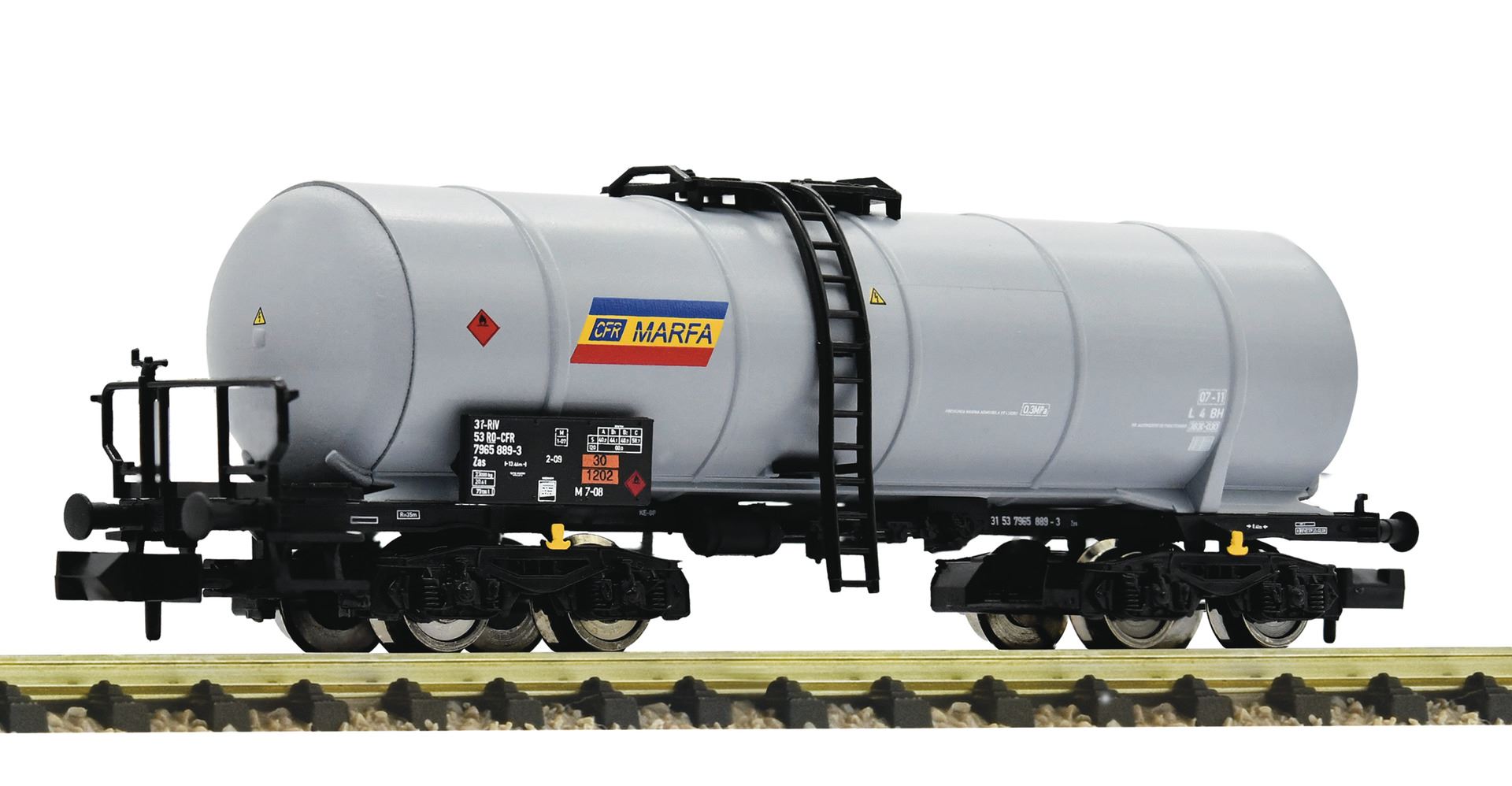 Vierachsiger Kesselwagen, Gattung Zas, der Rumänischen Staatsbahnen, Geschäftsbereich Güterverkehr. Technische Daten: Allgemeine Daten Schacht NEM 355 mit KK-Kinematik Abmessungen Länge über Puffer 88 mm Hersteller: Fleischmann