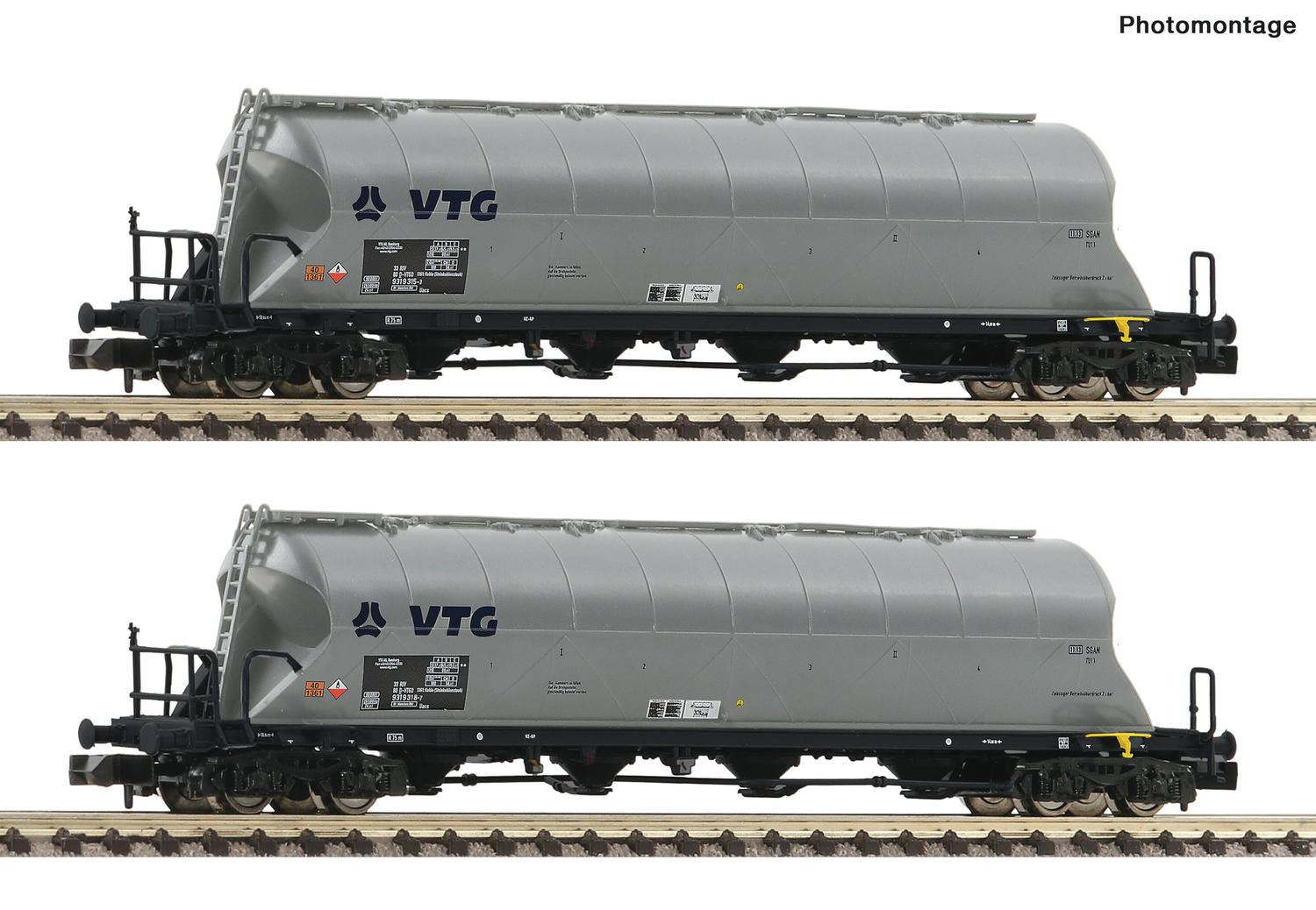 Wagenset mit zwei Staubsilowagen, Gattung Uacs-x, der VTG. Mit vielen angesetzten Steckteilen zum Teil in durchbrochener Ausführung Ganzzug geeignet Bei den vierachsigen Behälterwagen der Bauart Uacs handelt es sich um Güterwagen für den Transport von Schütt- und Staubgütern. Untergliedert werden die Wagen je nach ihrem Transportgut: Während die Uacs-x mit Industriegütern, wie Kohlestaub, beladen sind, werden die Uacs-y für den Transport von Lebensmittelgütern, wie Soda oder Mehl, verwendet. Die großen Originale verfügen dabei über einen speziellen Epoxidharz-Innenanstrich und eine pneumatische Auflockerungseinrichtung. Beide Bauarten, die Uacs-x und die Uacs-y, besitzen den gleichen Grundaufbau mit UIC-Drehgestellen der Bauart Y 25 Cs sowie ein geschweißtes Untergestell. Die Befüllung der Wagen erfolgt über Einfülldeckel auf dem Behälterdach, welche durch Laufstege erreicht werden können. Entleert werden die Wagen durch ein Druckluftsystem. Technische Daten: Allgemeine Daten Schacht Hersteller: Fleischmann