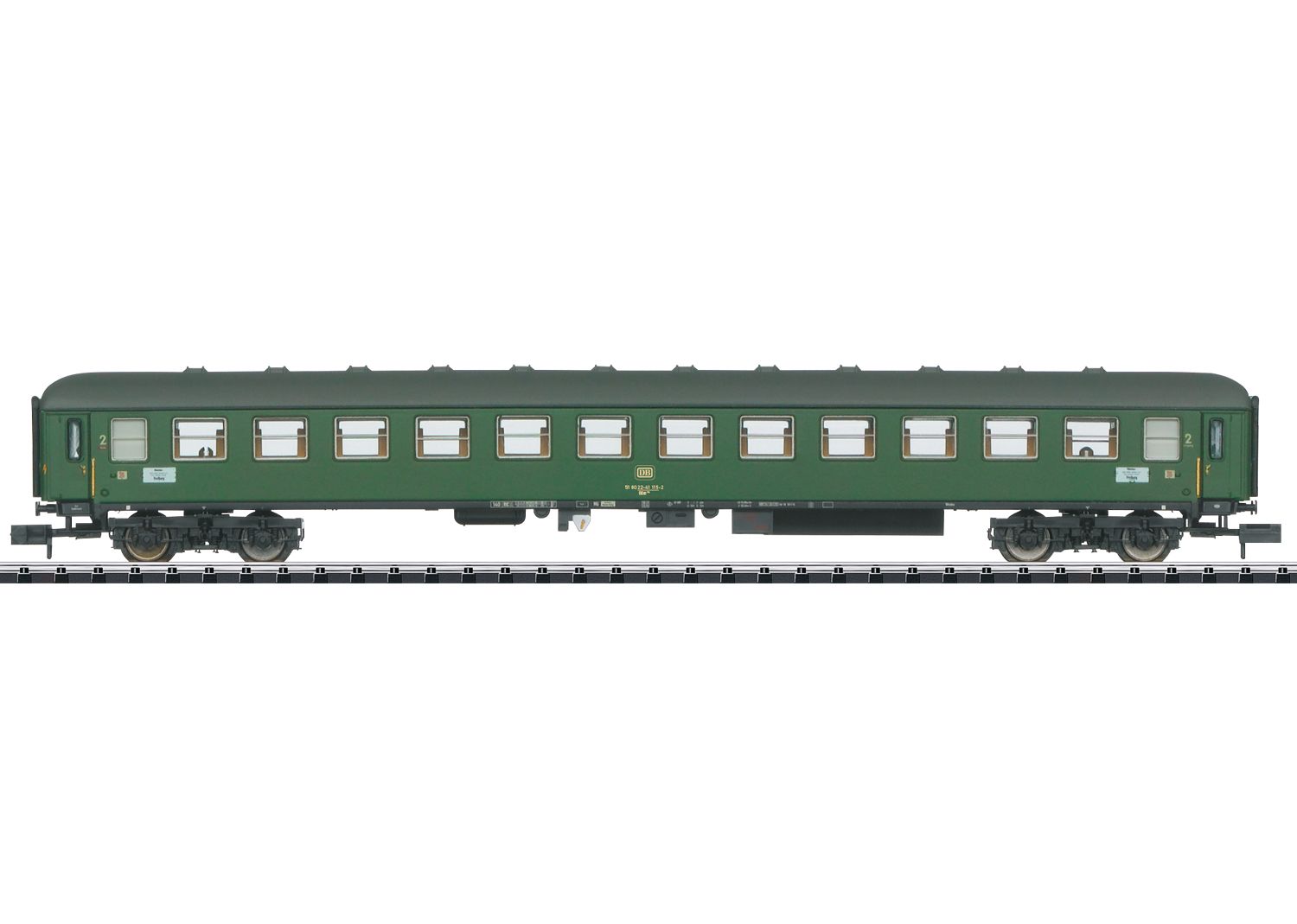Vorbild: Schnellzugwagen 2. Klasse Büm 234 der Deutschen Bundesbahn (DB), in chromoxidgrüner Grundfarbgebung, im Zustand um 1973. Wagenlauf Nürnberg - Heilbronn - Mannheim. Modell: Mit Kinematik für Kurzkupplung, vorbereitet für den nachträglichen Einbau einer Innenbeleuchtung. Länge über Puffer 165 mm. Die dazu passende Innenbeleuchtung: 66612 LED-Innenbeleuchtung.