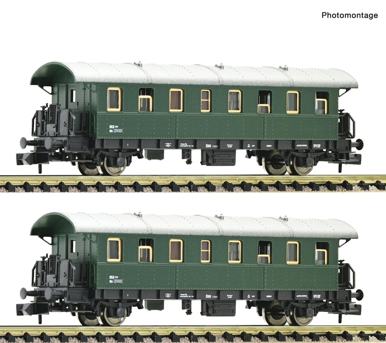 Wagenset mit zwei „Donnerbüchsen“-Personenwagen, Gattung Bih, der Österreichischen Bundesbahnen.Technische Daten: Allgemeine Daten Mit Inneneinrichtung ausgestattet Schacht NEM 355 mit KK-Kinematik Abmessungen Länge über Puffer 174 mm Hersteller: Fleischmann