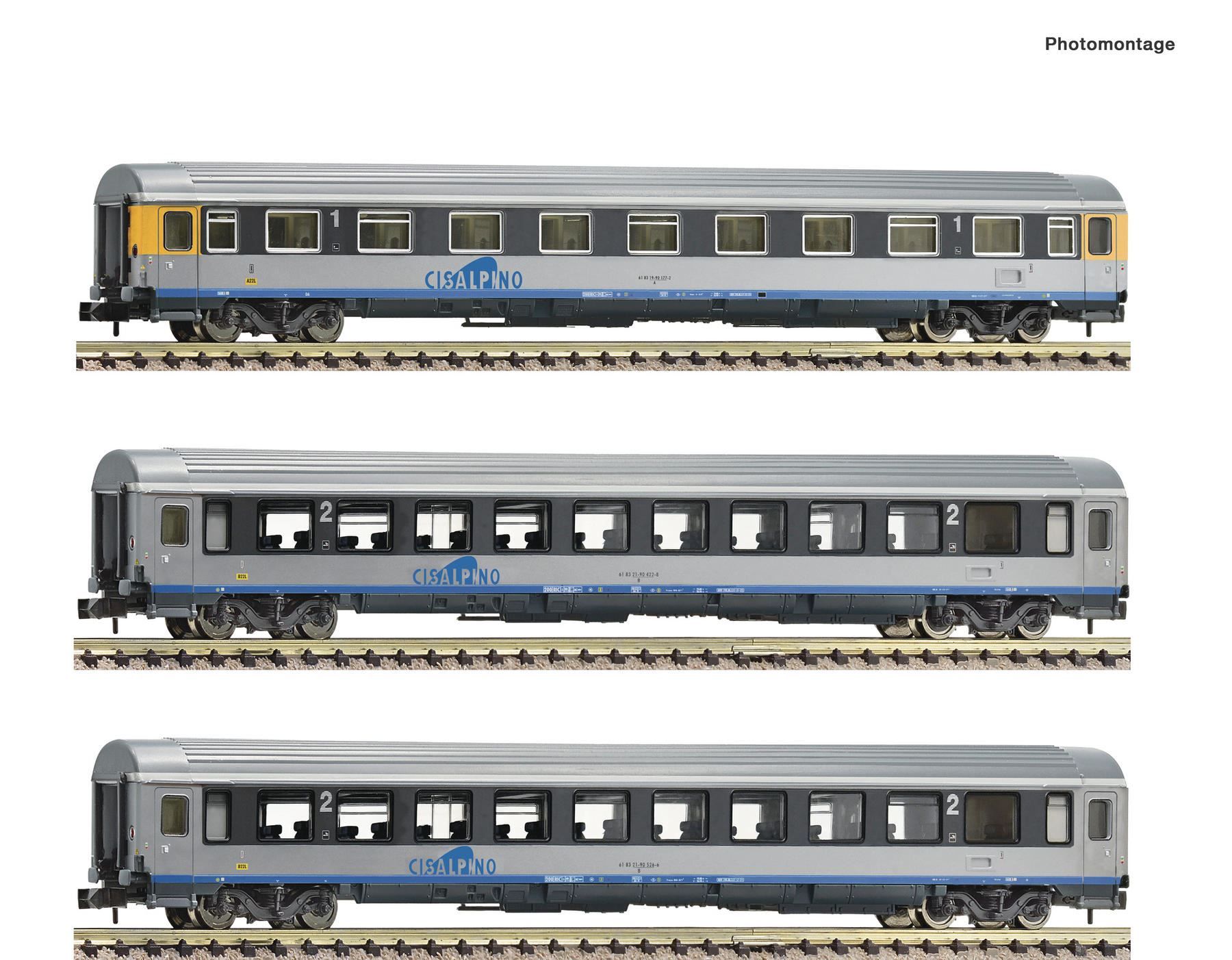 Wagenset mit drei Eurofima-Wagen der Cisalpino Bestehend aus einem Eurofima-Wagen 1. Klasse, Gattung A und zwei Eurofima-Wagen 2. Klasse, Gattung B. Innenbeleuchtung Artikelnummer 946901 Inneneinrichtung Mit Inneneinrichtung ausgestattet Kupplung Schacht NEM 355 mit KK-Kinematik Elektrik Innenbeleuchtung Nachrüstbar Abmessungen Länge über Puffer 495 mm
